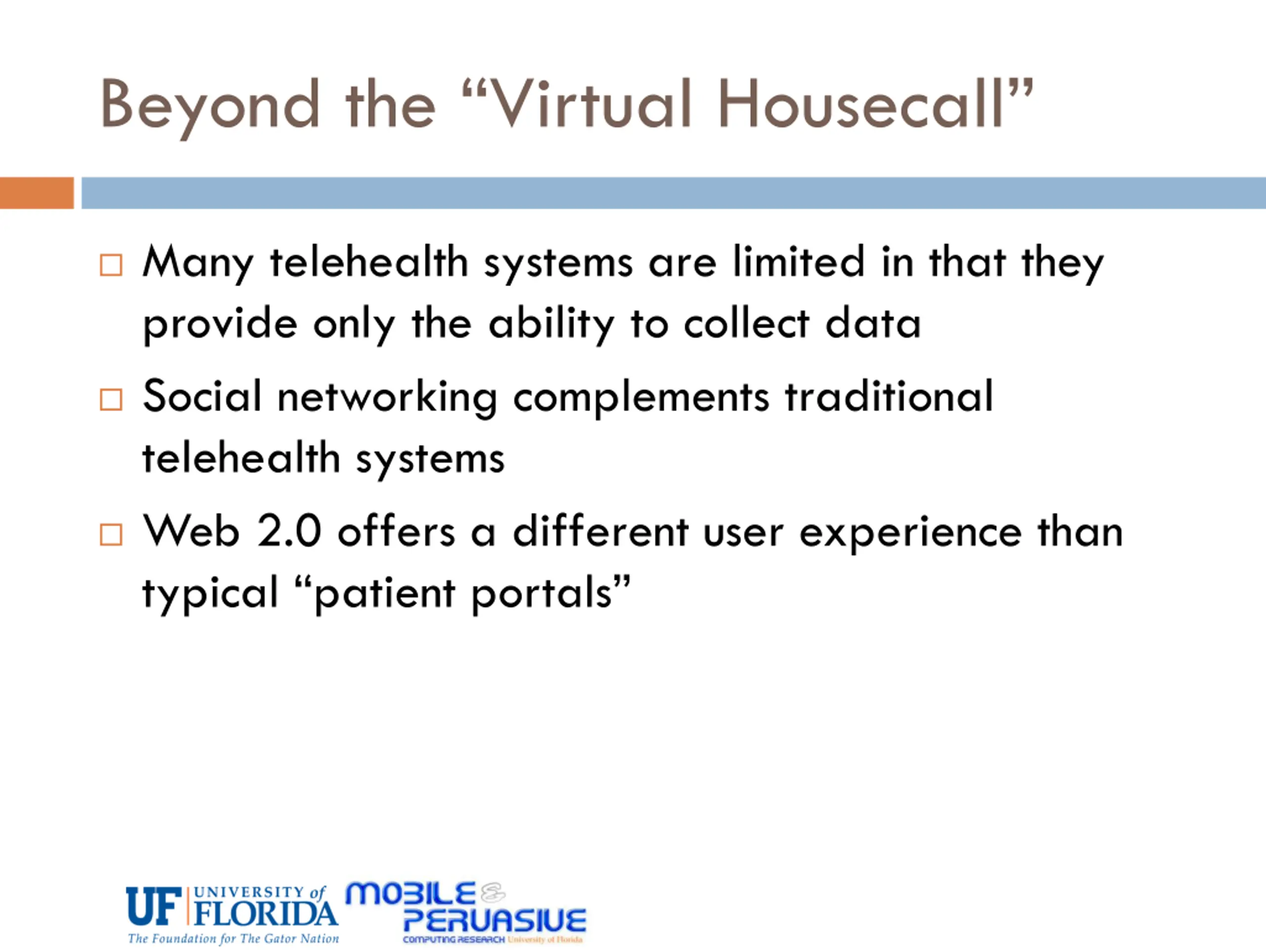 Beyond the Virtual Housecall Many telehealth systems are limited in that they provide only the ability to collect data Social networking complements traditional telehealth systems Web 2.0 offers a different user experience than typical patient portals