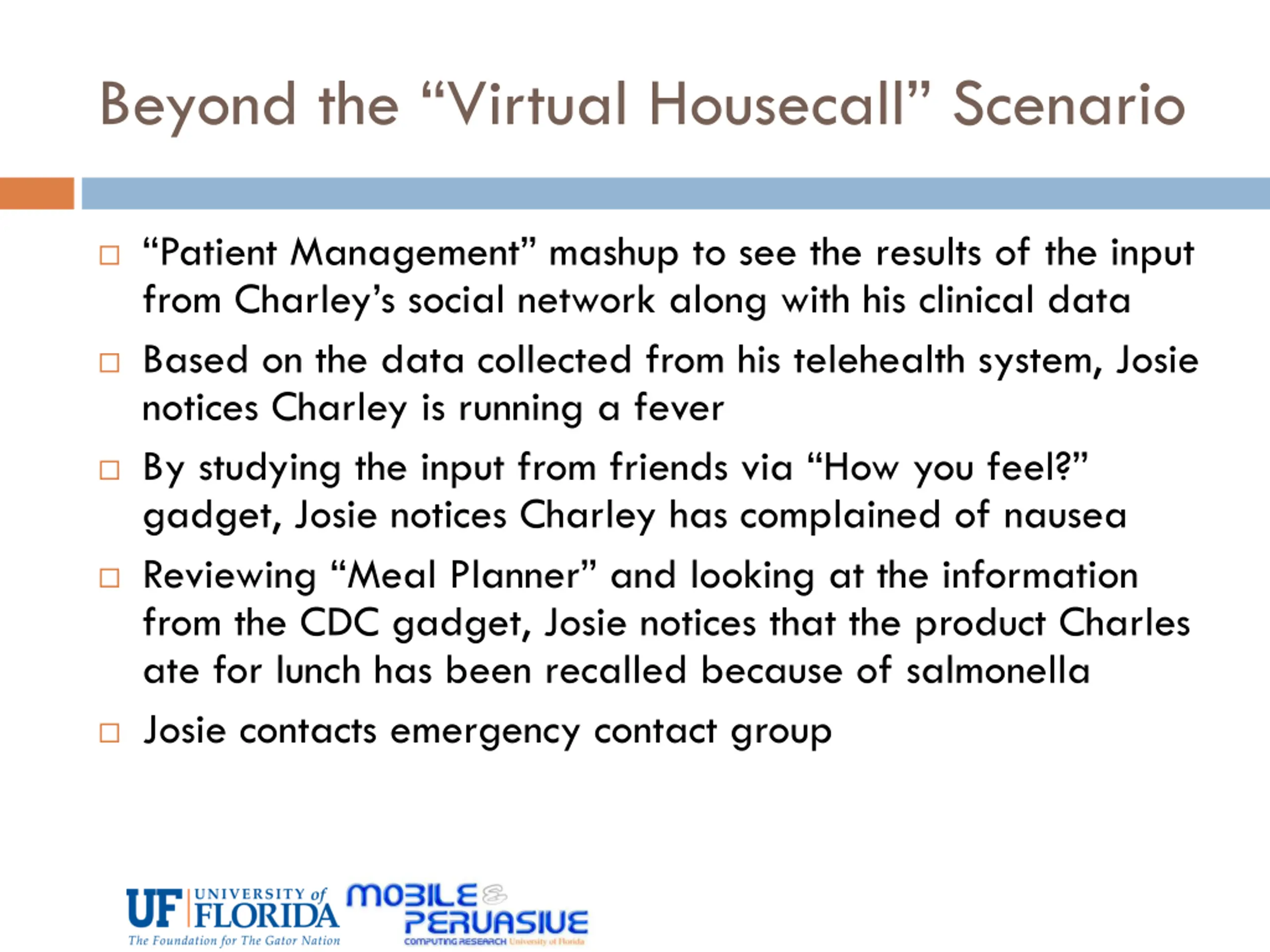 Beyond the Virtual Housecall Scenario Patient Management mashup to see the results of the input from Charley s social network along with his clinical data Based on the data collected from his telehealth system, Josie notices Charley is running a fever By studying the input from friends via How you feel? gadget, Josie notices Charley has complained of nausea Reviewing Meal Planner and looking at the information from the CDC gadget, Josie notices that the product Charles ate for lunch has been recalled because of salmonella Josie contacts emergency contact group