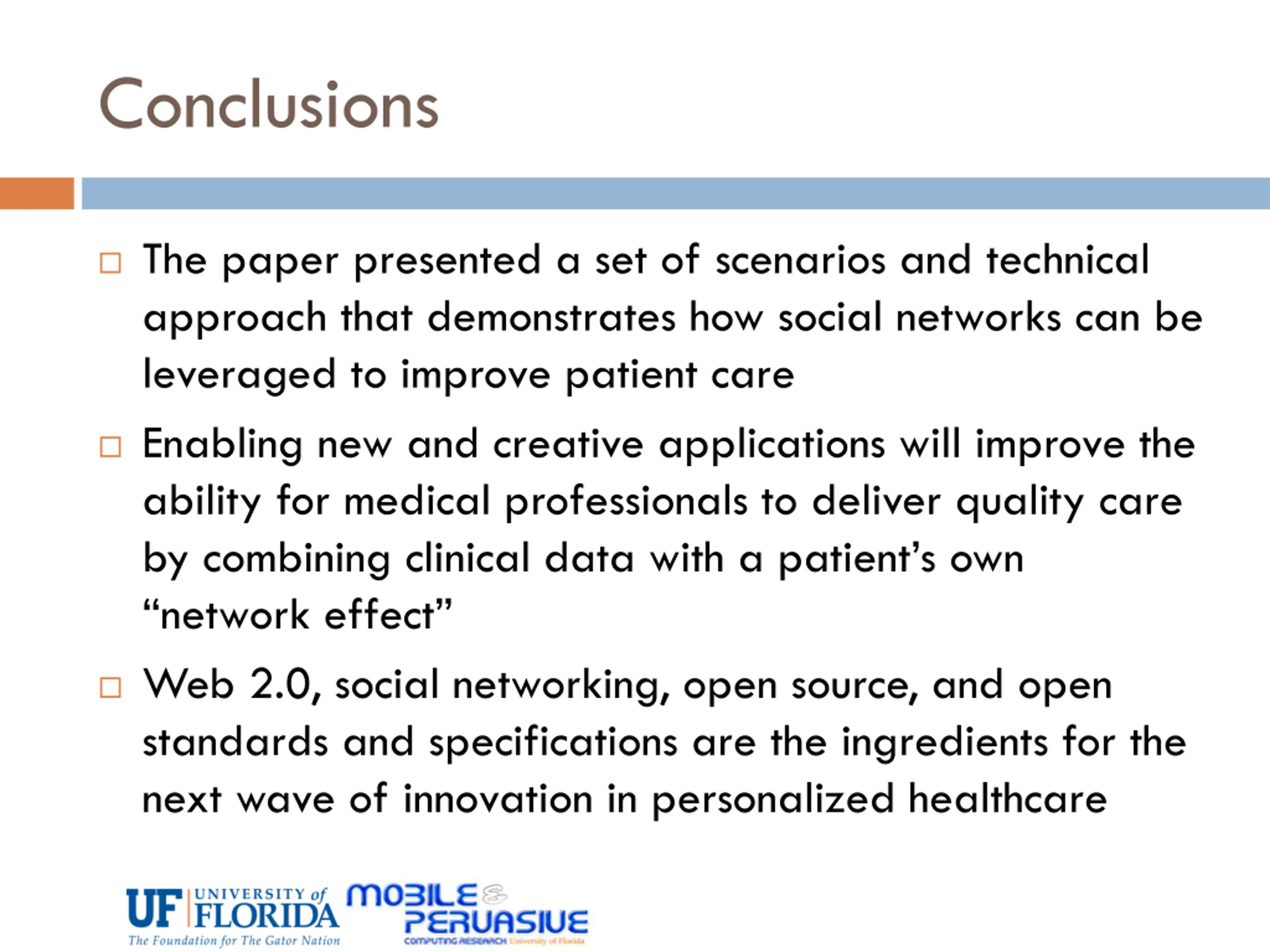Conclusions The paper presented a set of scenarios and technical approach that demonstrates how social networks can be leveraged to improve patient care Enabling new and creative applications will improve the ability for medical professionals to deliver quality care by combining clinical data with a patient s own network effect Web 2.0, social networking, open source, and open standards and specifications are the ingredients for the next wave of innovation in personalized healthcare