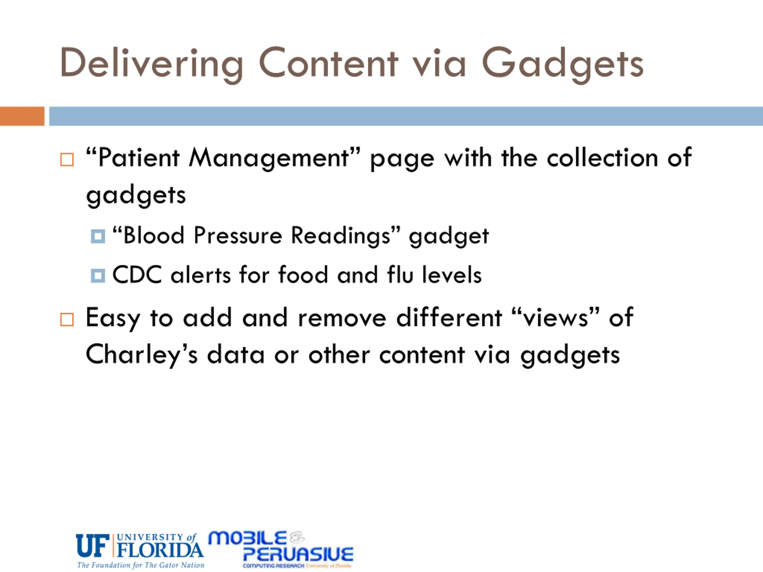 Delivering Content via Gadgets Patient Management page with the collection of gadgets Blood Pressure Readings gadget CDC alerts for food and flu levels Easy to add and remove different views of Charley s data or other content via gadgets