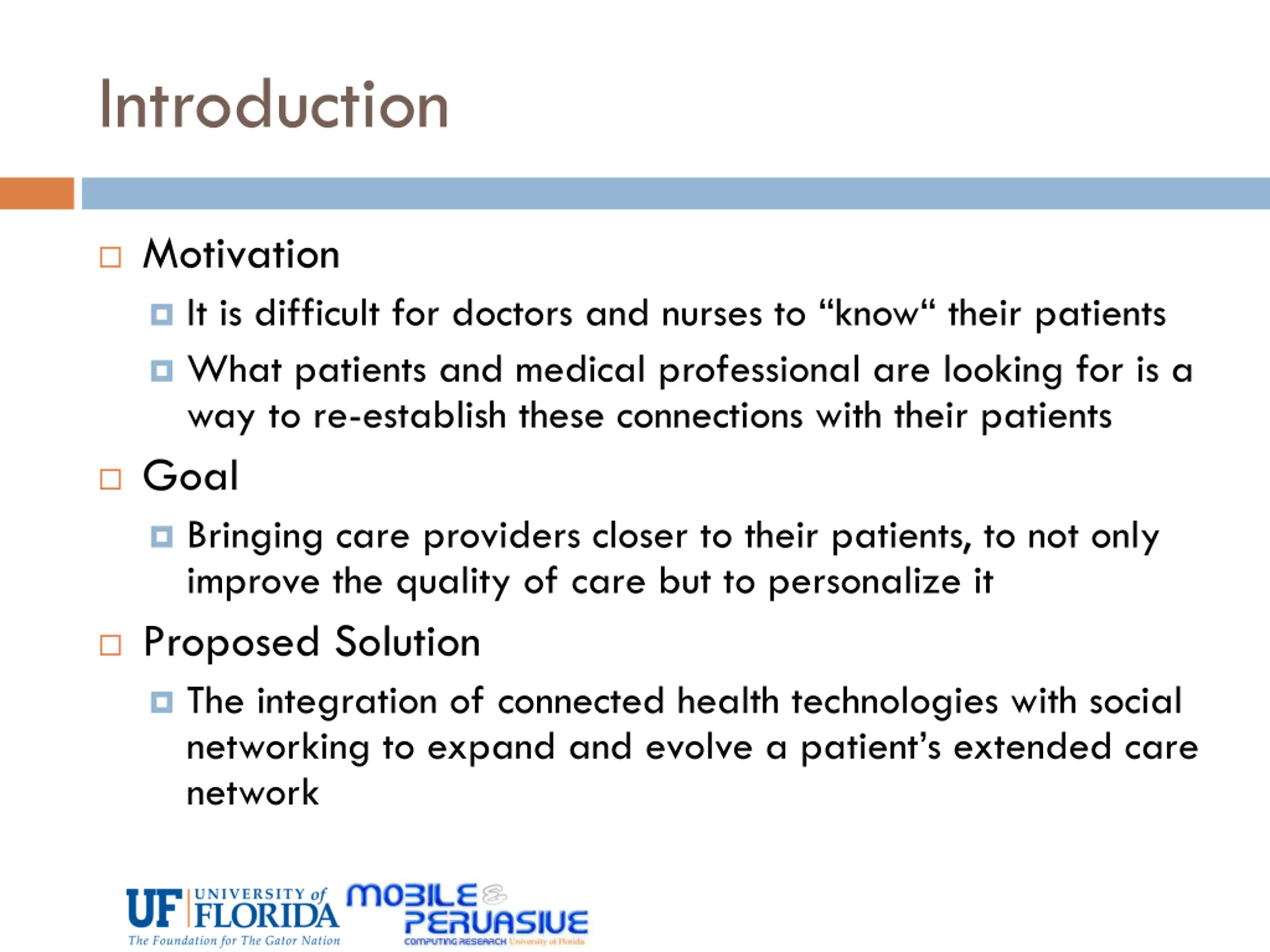 Introduction Motivation It is difficult for doctors and nurses to know their patients What patients and medical professional are looking for is a way to re-establish these connections with their patients Goal Bringing care providers closer to their patients, to not only improve the quality of care but to personalize it Proposed Solution The integration of connected health technologies with social networking to expand and evolve a patient s extended care network