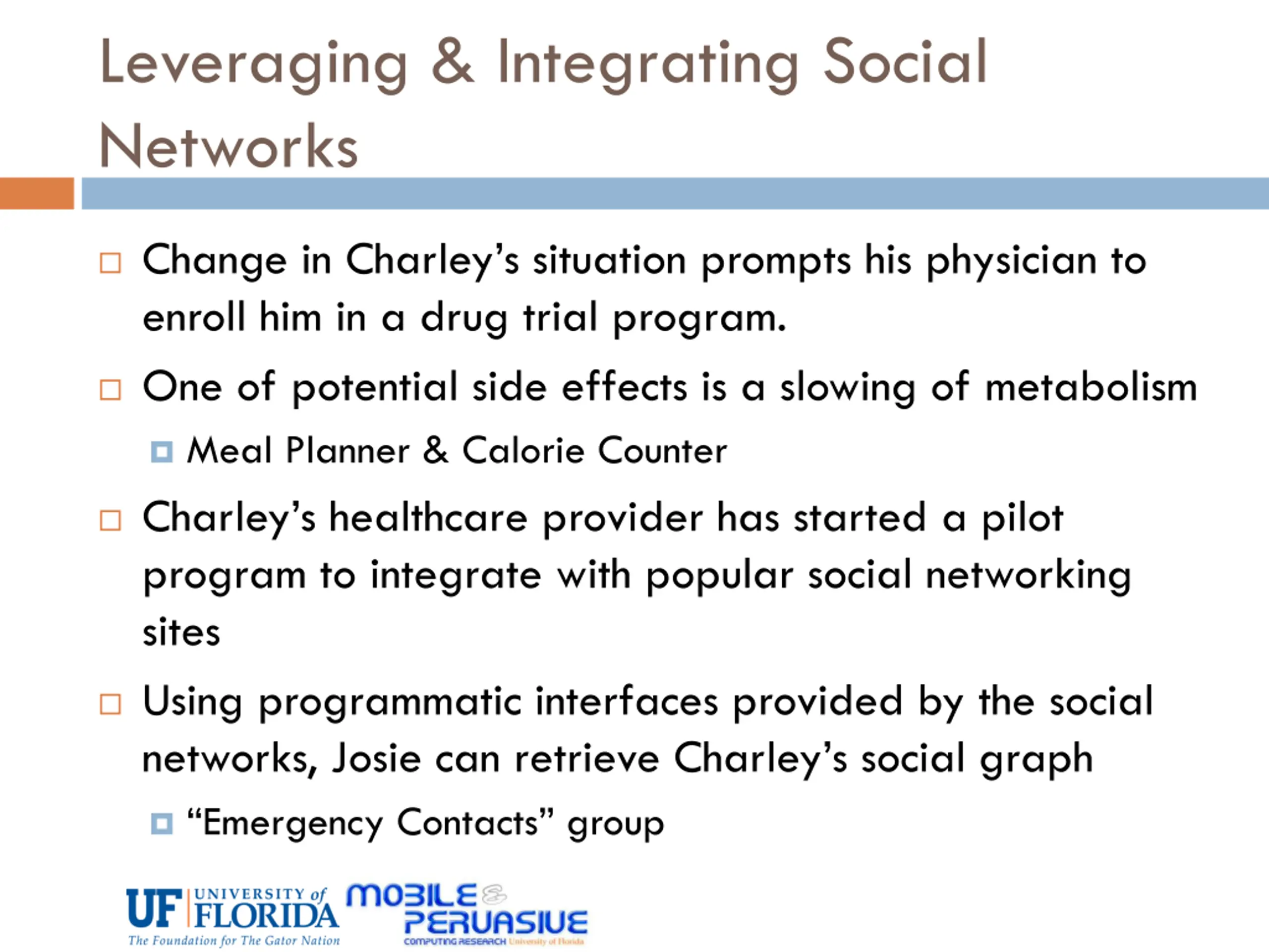 Leveraging & Integrating Social Networks Change in Charley s situation prompts his physician to enroll him in a drug trial program. One of potential side effects is a slowing of metabolism Meal Planner & Calorie Counter Charley s healthcare provider has started a pilot program to integrate with popular social networking sites Using programmatic interfaces provided by the social networks, Josie can retrieve Charley s social graph Emergency Contacts group