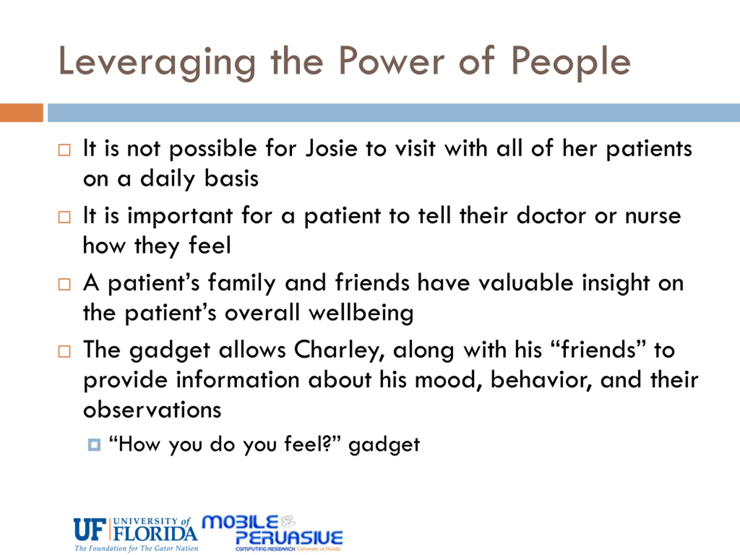 Leveraging the Power of People It is not possible for Josie to visit with all of her patients on a daily basis It is important for a patient to tell their doctor or nurse how they feel A patient s family and friends have valuable insight on the patient s overall wellbeing The gadget allows Charley, along with his friends to provide information about his mood, behavior, and their observations How you do you feel? gadget