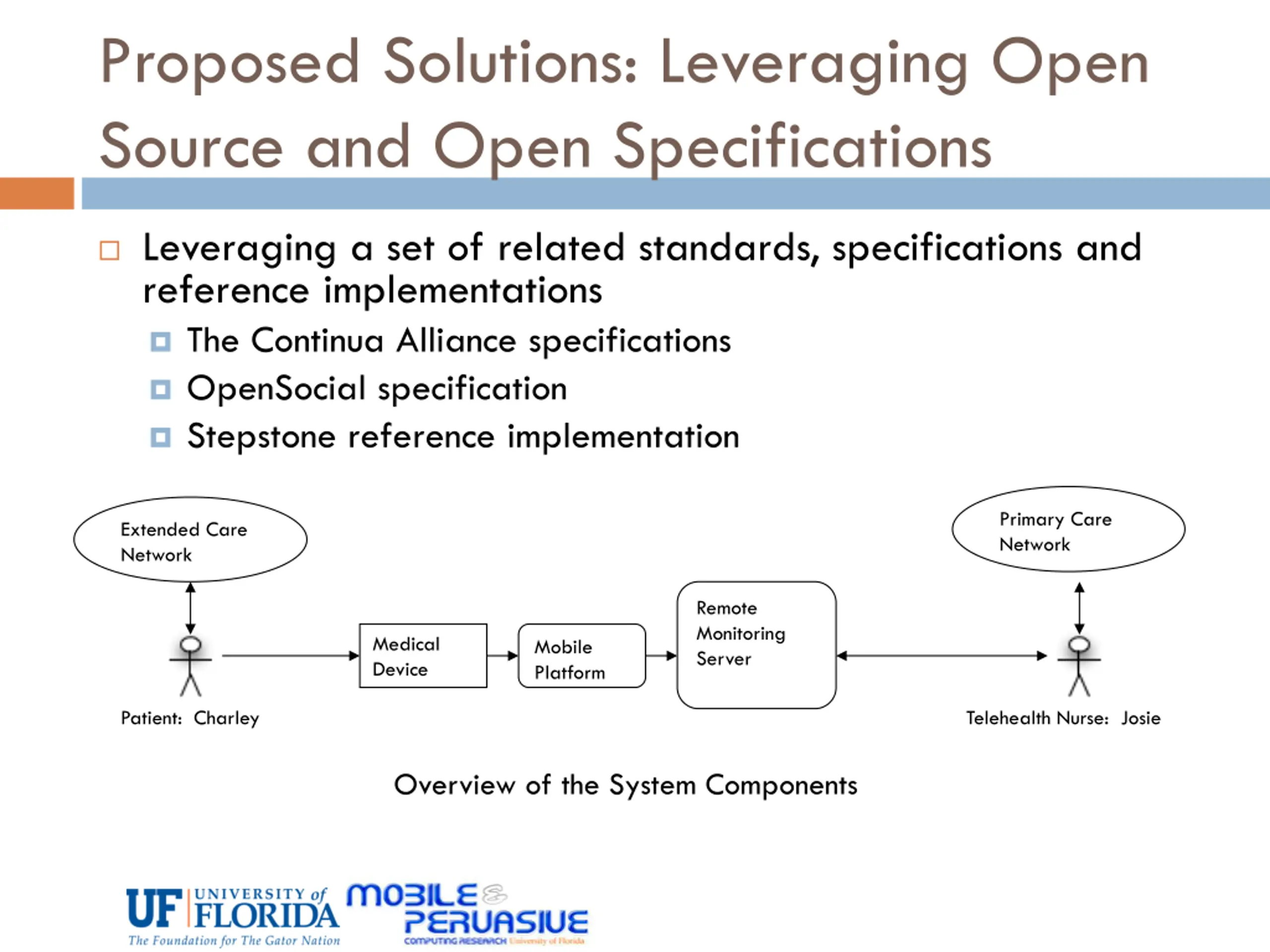 Proposed Solutions: Leveraging Open Source and Open Specifications Leveraging a set of related standards, specifications and reference implementations The Continua Alliance specifications OpenSocial specification Stepstone reference implementation Primary Care Network Extended Care Network Remote Monitoring Server Medical Device Mobile Platform Patient: Charley Telehealth Nurse: Josie Overview of the System Components