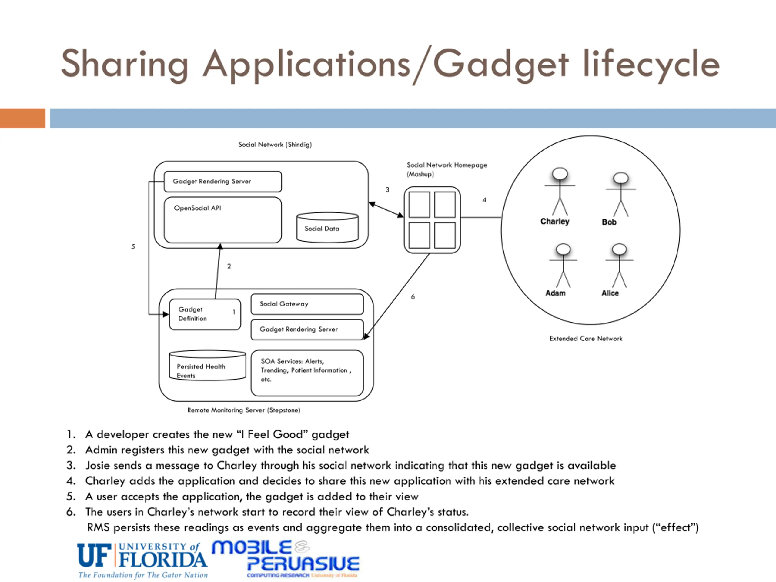 Sharing Applications/Gadget lifecycle Social Network (Shindig) Social Network Homepage (Mashup) Gadget Rendering Server 3 4 OpenSocial API Social Data 5 2 6 Social Gateway Gadget Definition 1 Gadget Rendering Server Extended Care Network SOA Services: Alerts, Trending, Patient Information , etc. Persisted Health Events Remote Monitoring Server (Stepstone) 1. A developer creates the new I Feel Good gadget 2. Admin registers this new gadget with the social network 3. Josie sends a message to Charley through his social network indicating that this new gadget is available 4. Charley adds the application and decides to share this new application with his extended care network 5. A user accepts the application, the gadget is added to their view 6. The users in Charley s network start to record their view of Charley s status. RMS persists these readings as events and aggregate them into a consolidated, collective social network input ( effect )