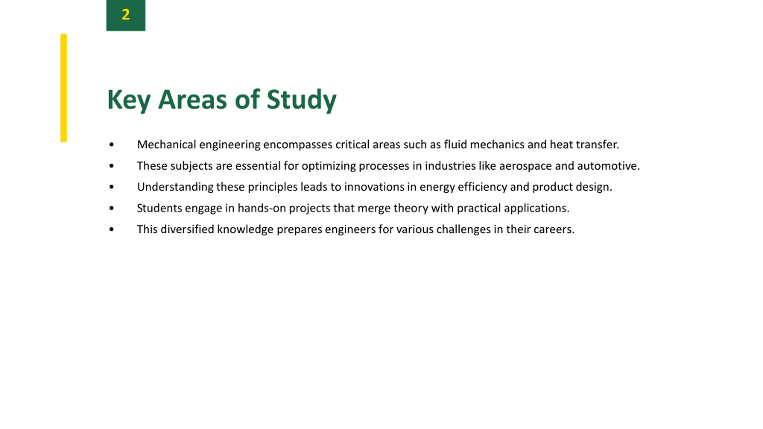 2 Key Areas of Study Mechanical engineering encompasses critical areas such as fluid mechanics and heat transfer. These subjects are essential for optimizing processes in industries like aerospace and automotive. Understanding these principles leads to innovations in energy efficiency and product design. Students engage in hands-onprojects that merge theory with practical applications. This diversified knowledge prepares engineers for various challenges in their careers.