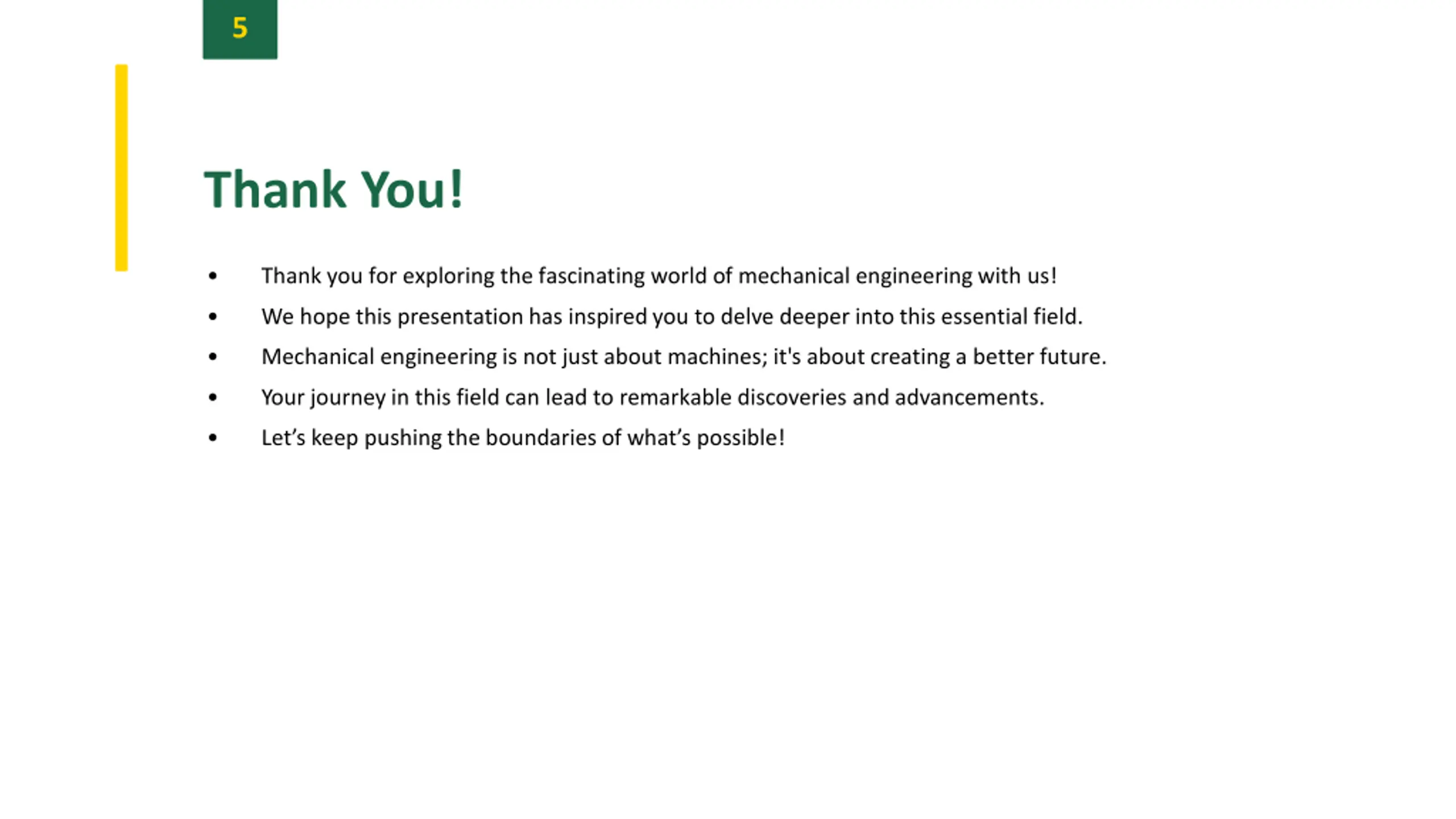 5 Thank You! Thank you for exploring the fascinating world of mechanical engineeringwith us! We hope this presentation has inspiredyou to delve deeper into this essential field. Mechanical engineering is not just about machines; it's about creating a better future. Your journey in this field can lead to remarkable discoveries and advancements. Let s keep pushing the boundaries of what s possible!