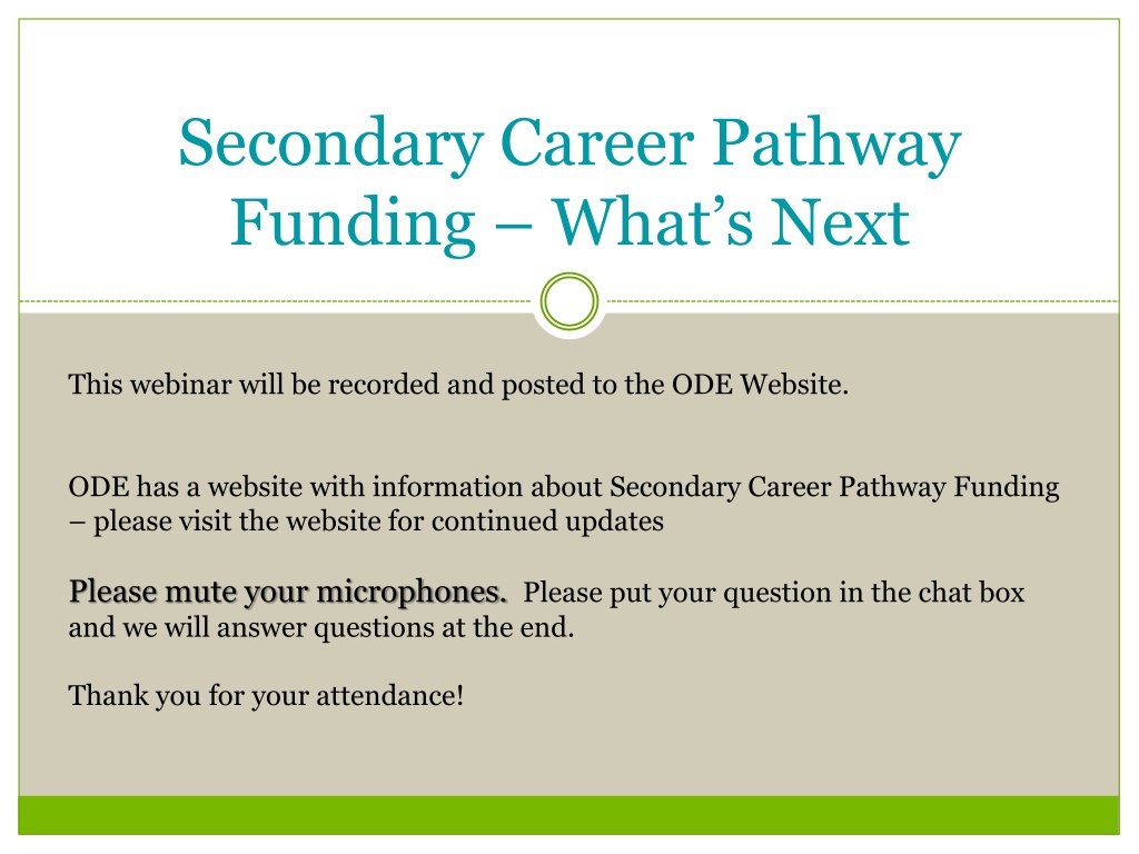 Secondary Career Pathway Funding What s Next This webinar will be recorded and posted to the ODE Website. ODE has a website with information about Secondary Career Pathway Funding please visit the website for continued updates Please mute your microphones. Please put your question in the chat box and we will answer questions at the end. Thank you for your attendance!