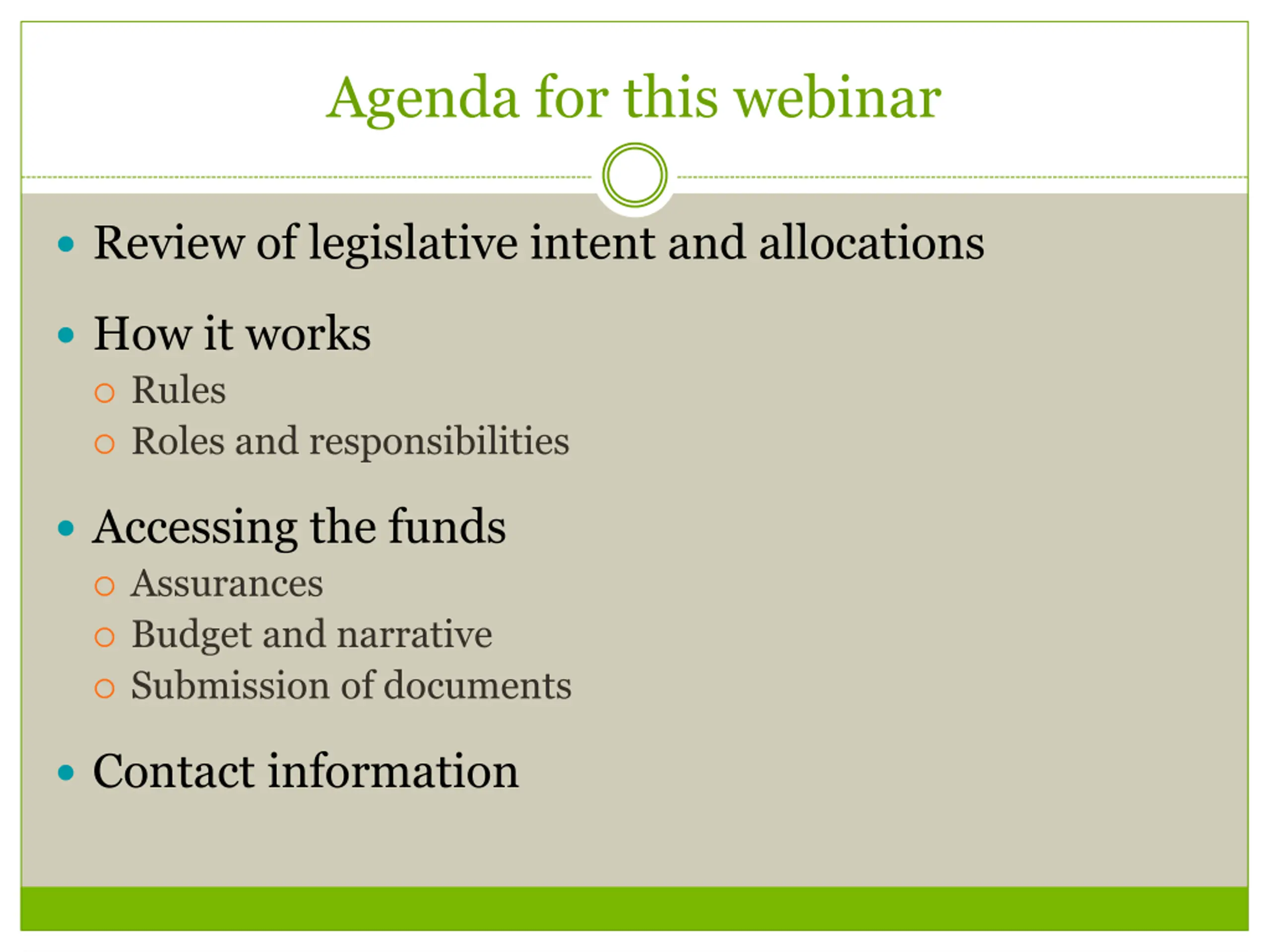 Agenda for this webinar Review of legislative intent and allocations How it works Rules Roles and responsibilities Accessing the funds Assurances Budget and narrative Submission of documents Contact information