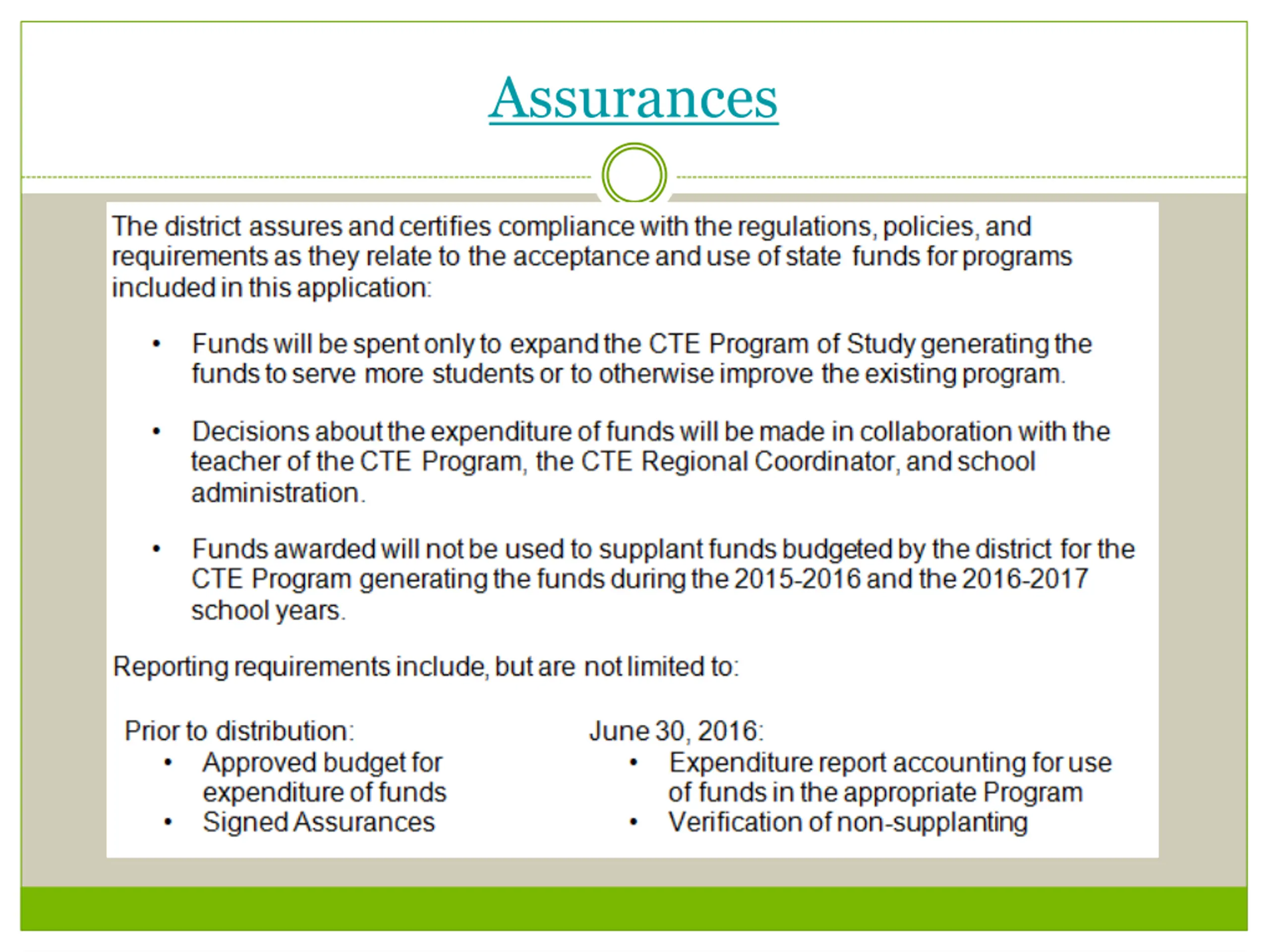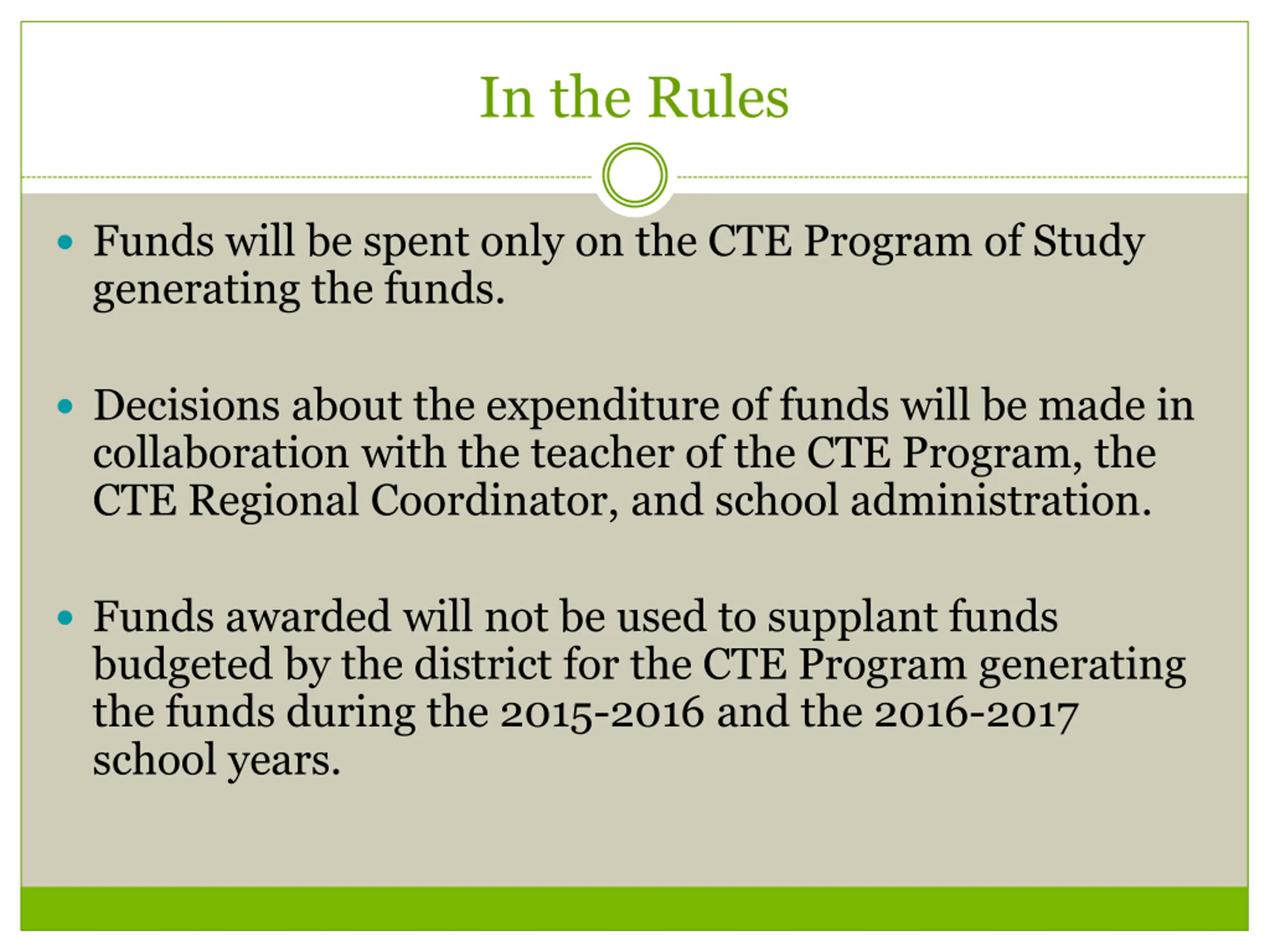 In the Rules Funds will be spent only on the CTE Program of Study generating the funds. Decisions about the expenditure of funds will be made in collaboration with the teacher of the CTE Program, the CTE Regional Coordinator, and school administration. Funds awarded will not be used to supplant funds budgeted by the district for the CTE Program generating the funds during the 2015-2016 and the 2016-2017 school years.