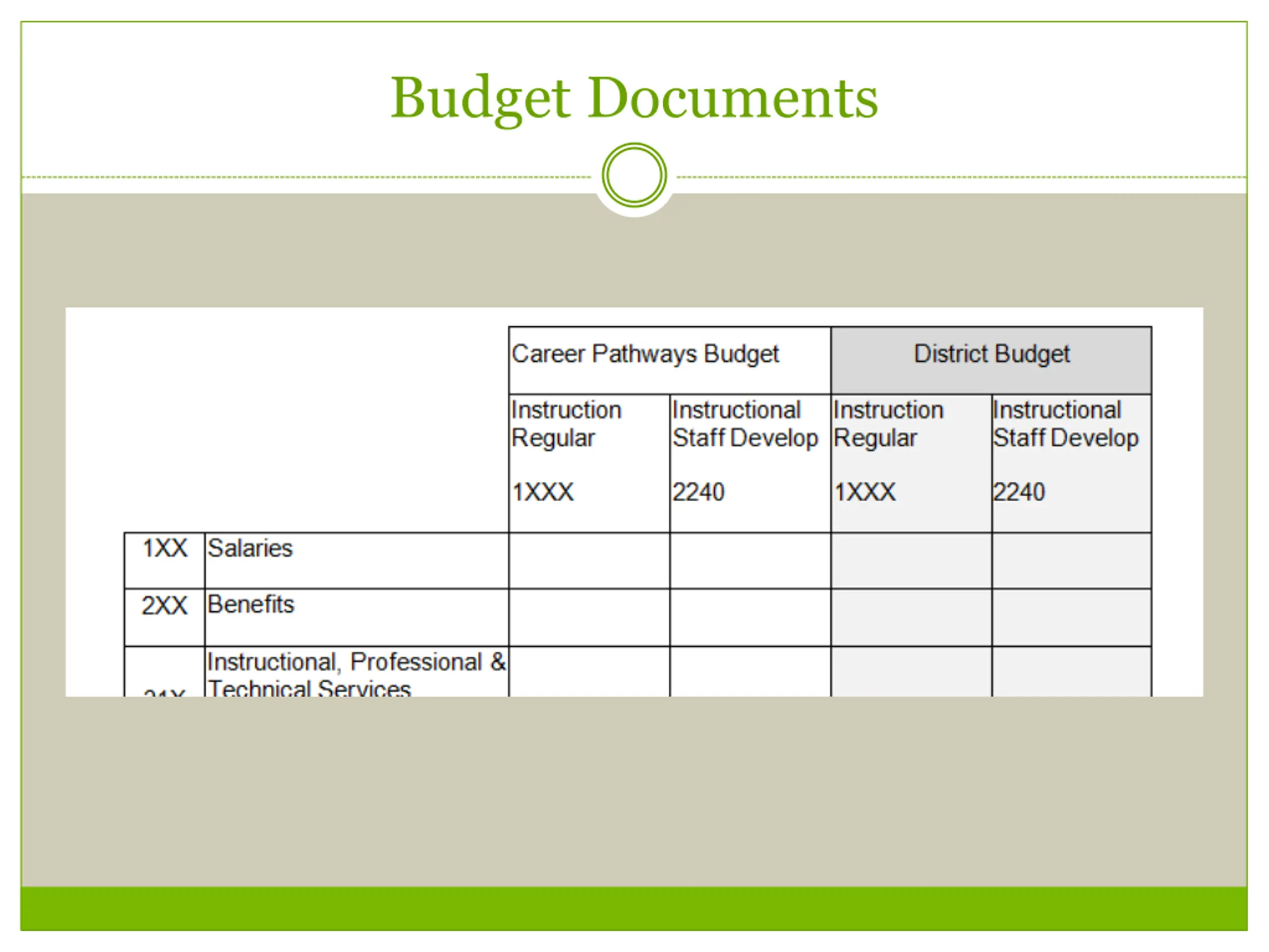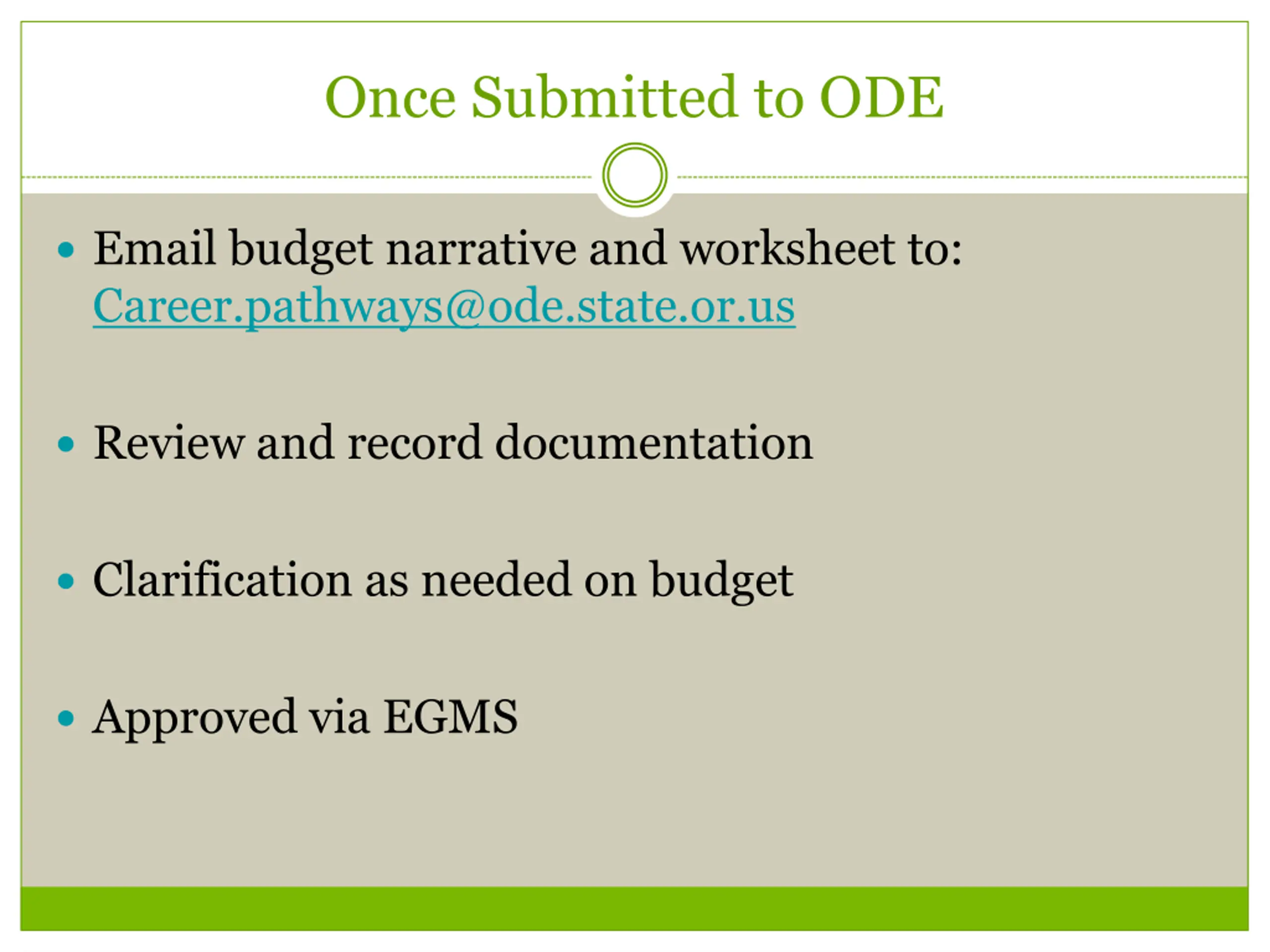 Once Submitted to ODE Email budget narrative and worksheet to: Career.pathways@ode.state.or.us Review and record documentation Clarification as needed on budget Approved via EGMS