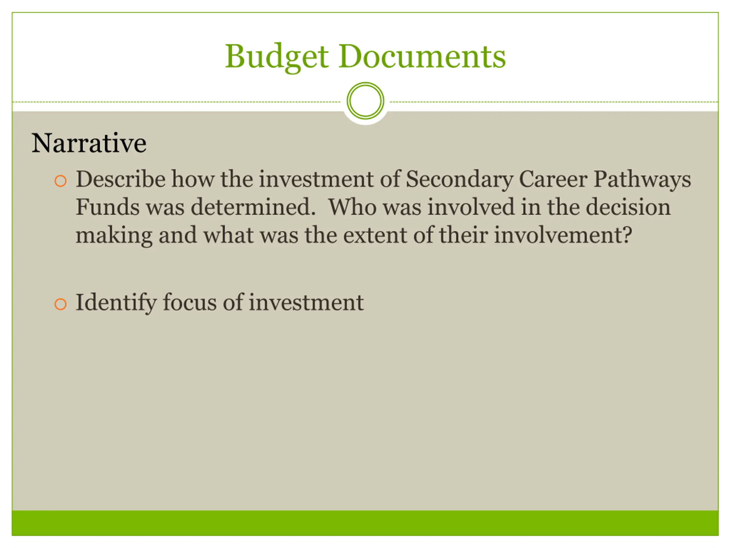Budget Documents Narrative Describe how the investment of Secondary Career Pathways Funds was determined. Who was involved in the decision making and what was the extent of their involvement? Identify focus of investment