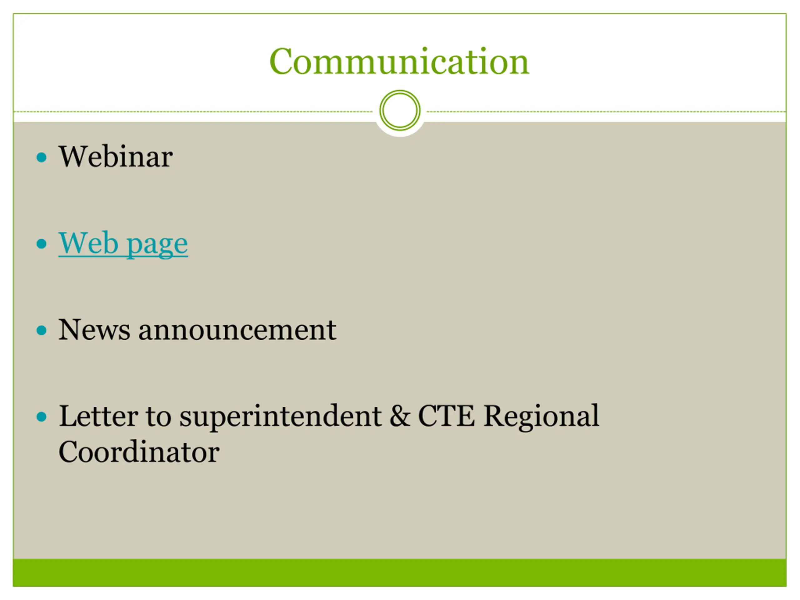 Communication Webinar Web page News announcement Letter to superintendent & CTE Regional Coordinator