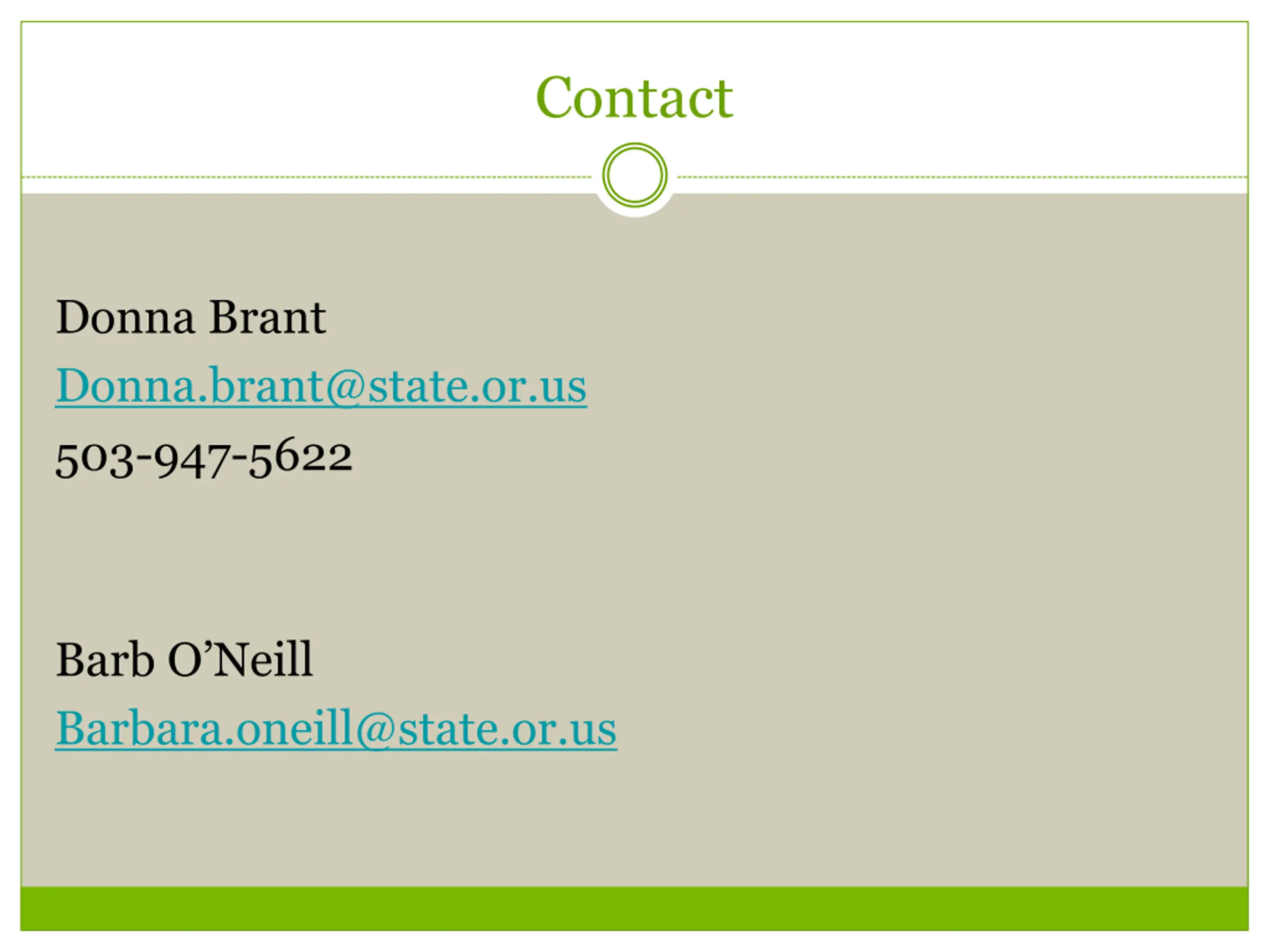 Contact Donna Brant Donna.brant@state.or.us 503-947-5622 Barb O Neill Barbara.oneill@state.or.us