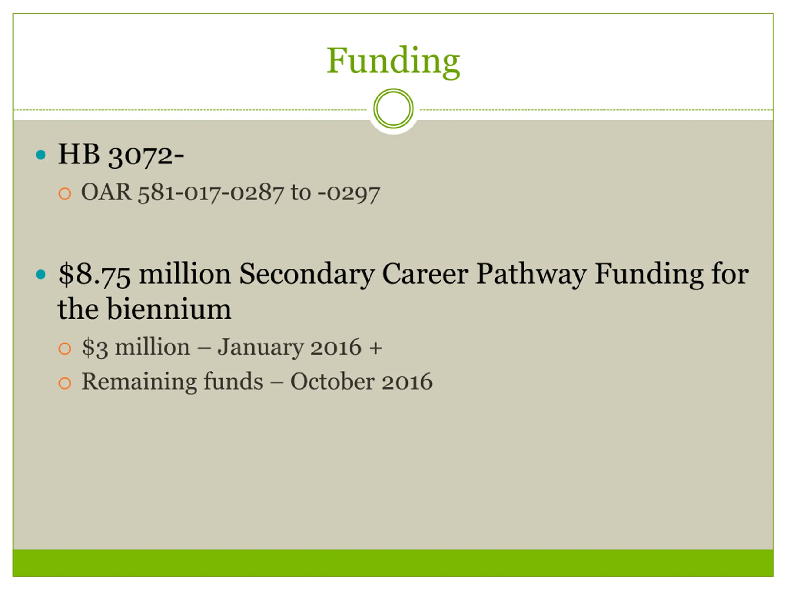 Funding HB 3072- OAR 581-017-0287 to -0297 $8.75 million Secondary Career Pathway Funding for the biennium $3 million January 2016 + Remaining funds October 2016