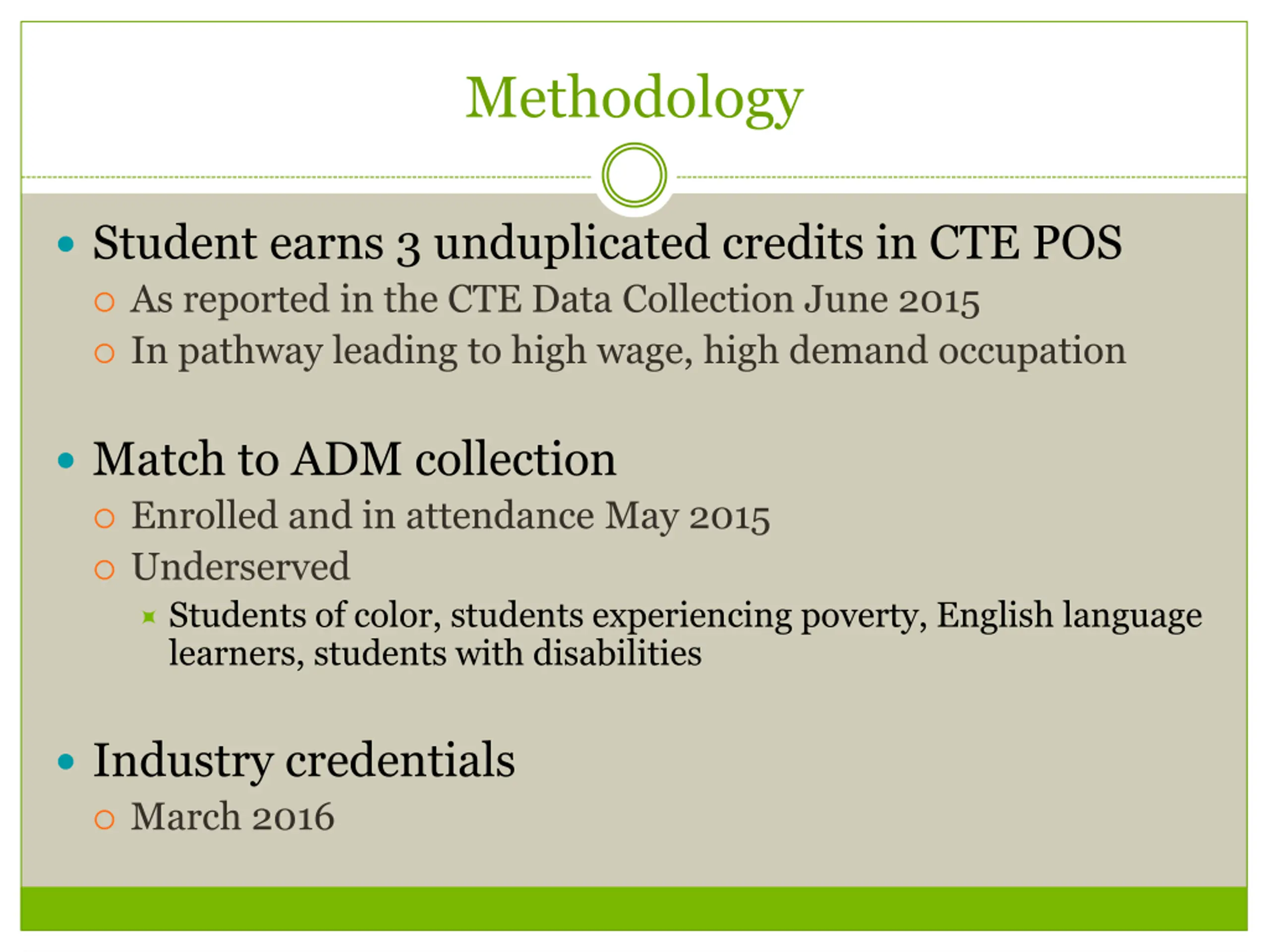 Methodology Student earns 3 unduplicated credits in CTE POS As reported in the CTE Data Collection June 2015 In pathway leading to high wage, high demand occupation Match to ADM collection Enrolled and in attendance May 2015 Underserved Students of color, students experiencing poverty, English language learners, students with disabilities Industry credentials March 2016
