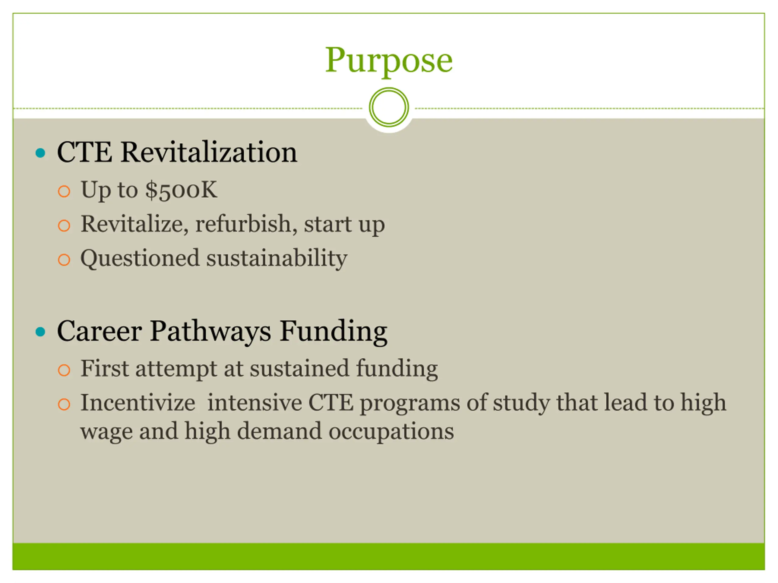 Purpose CTE Revitalization Up to $500K Revitalize, refurbish, start up Questioned sustainability Career Pathways Funding First attempt at sustained funding Incentivize intensive CTE programs of study that lead to high wage and high demand occupations