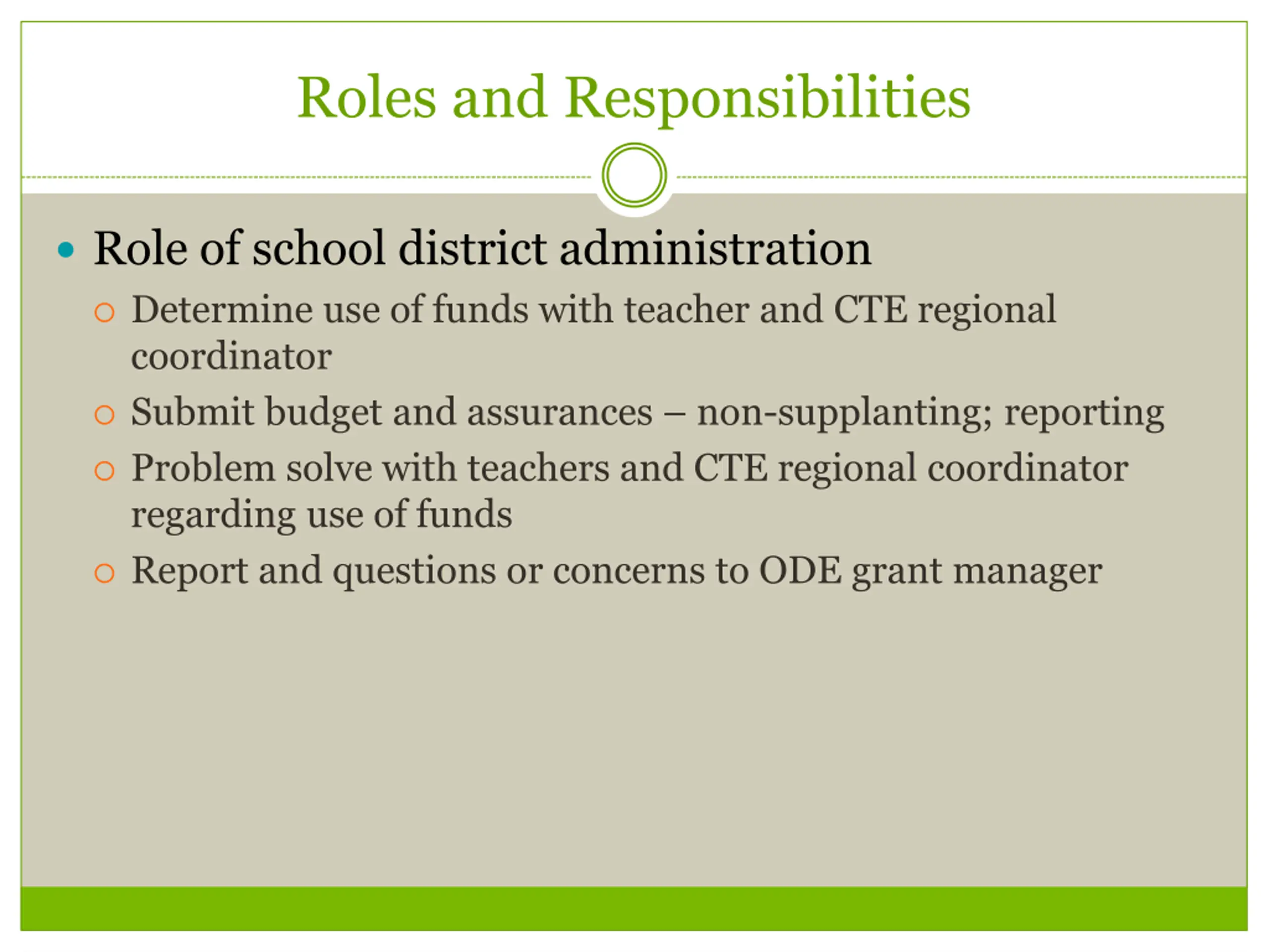 Roles and Responsibilities Role of school district administration Determine use of funds with teacher and CTE regional coordinator Submit budget and assurances non-supplanting; reporting Problem solve with teachers and CTE regional coordinator regarding use of funds Report and questions or concerns to ODE grant manager