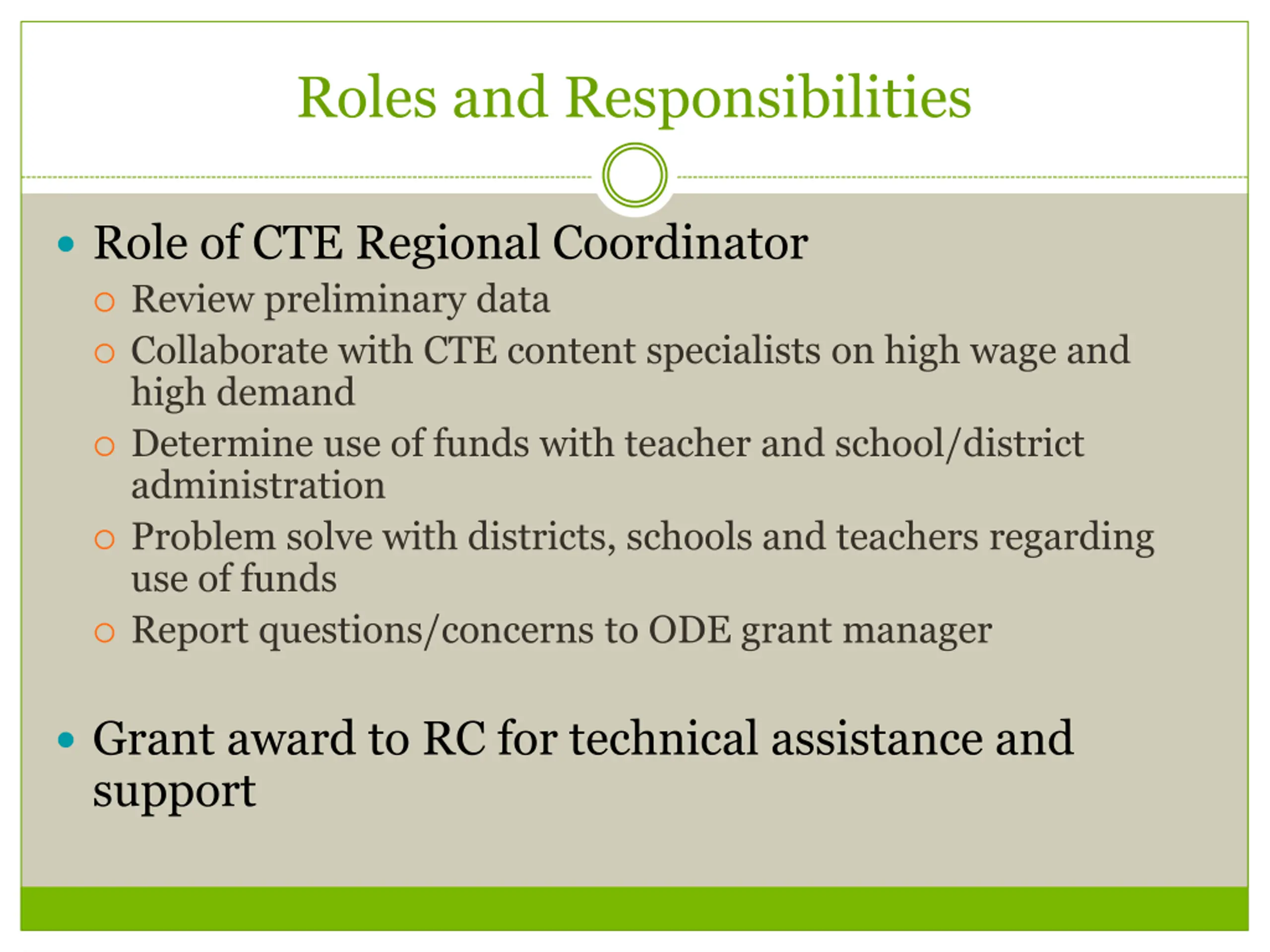 Roles and Responsibilities Role of CTE Regional Coordinator Review preliminary data Collaborate with CTE content specialists on high wage and high demand Determine use of funds with teacher and school/district administration Problem solve with districts, schools and teachers regarding use of funds Report questions/concerns to ODE grant manager Grant award to RC for technical assistance and support