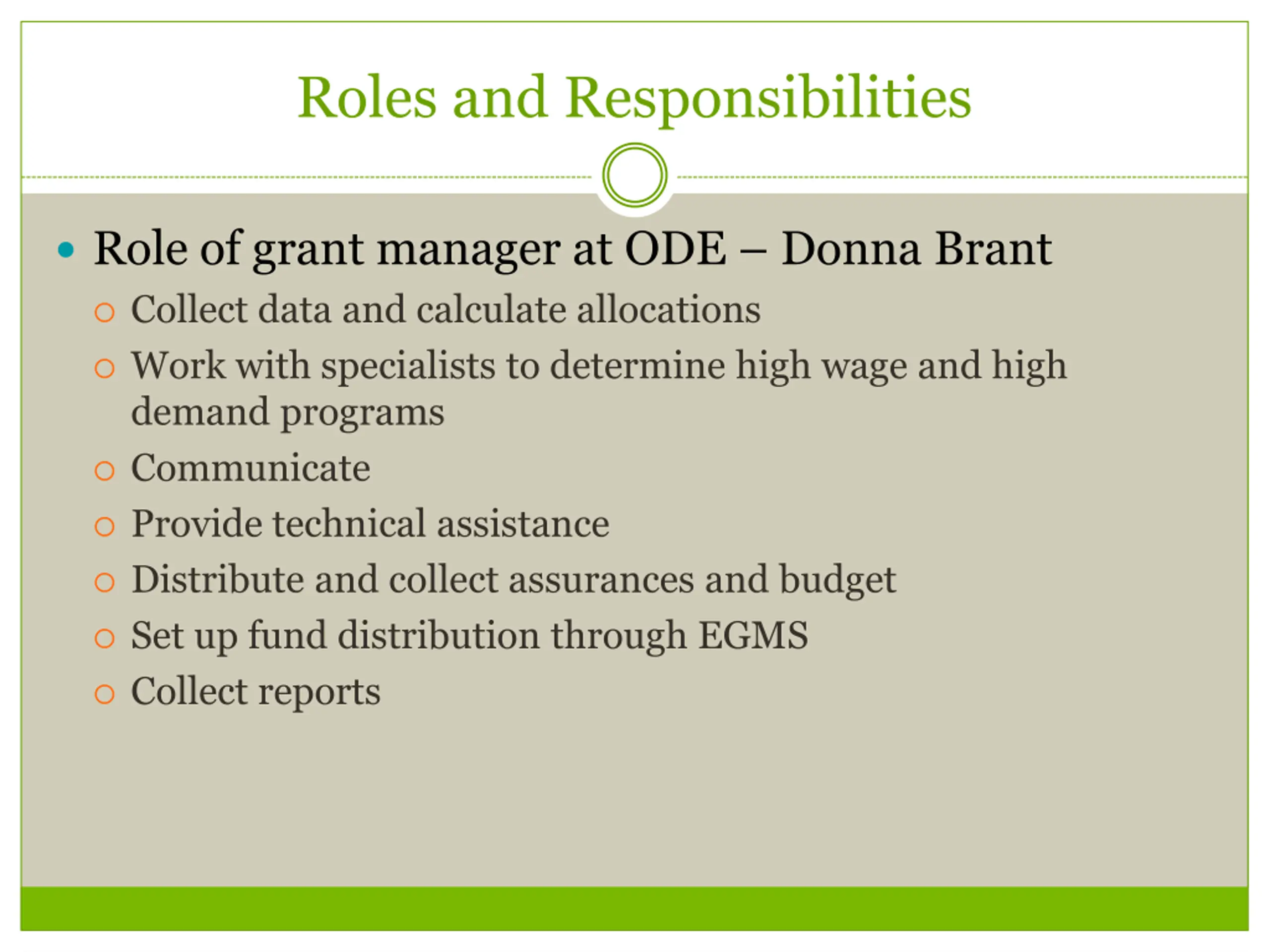 Roles and Responsibilities Role of grant manager at ODE Donna Brant Collect data and calculate allocations Work with specialists to determine high wage and high demand programs Communicate Provide technical assistance Distribute and collect assurances and budget Set up fund distribution through EGMS Collect reports
