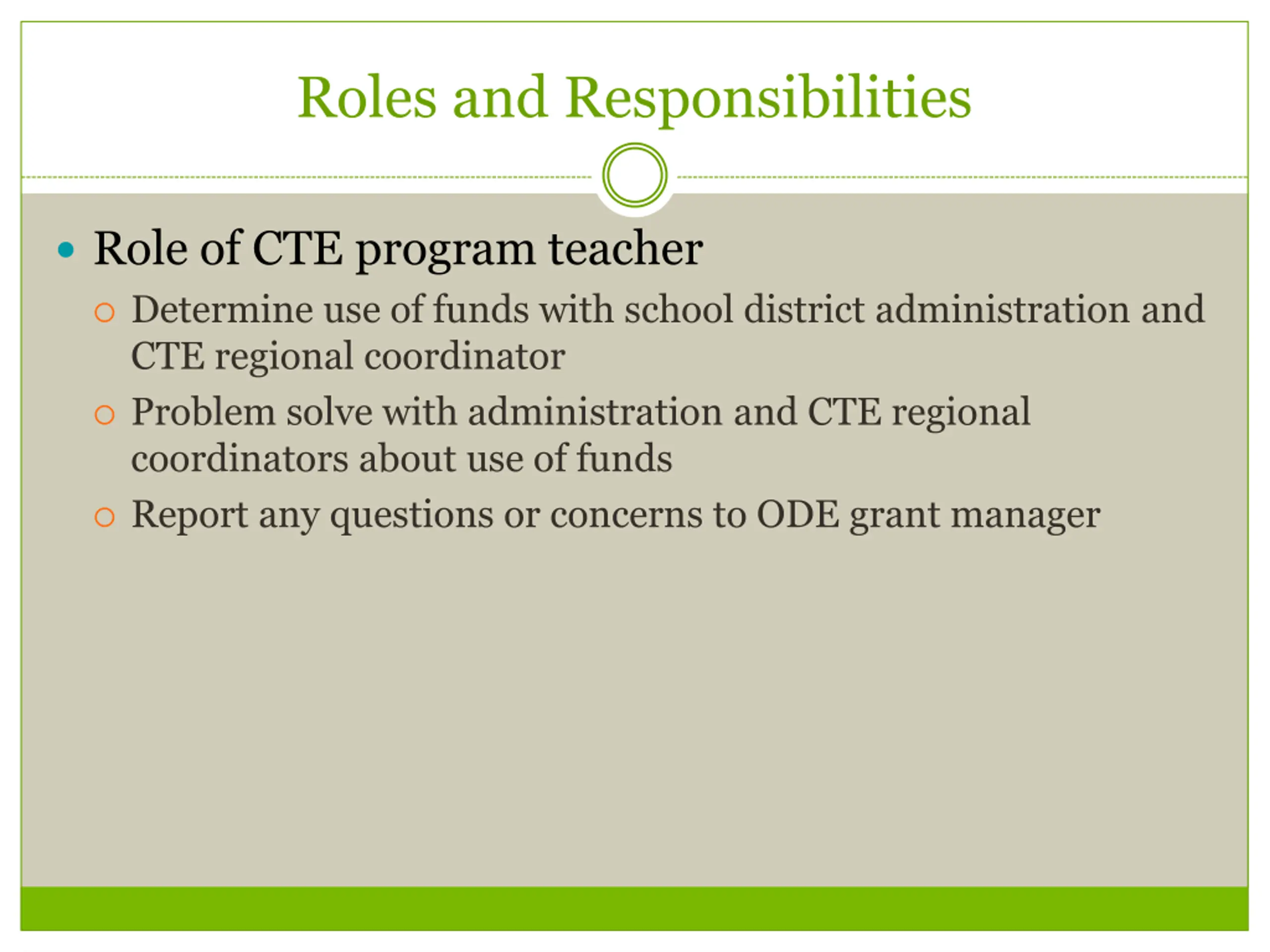 Roles and Responsibilities Role of CTE program teacher Determine use of funds with school district administration and CTE regional coordinator Problem solve with administration and CTE regional coordinators about use of funds Report any questions or concerns to ODE grant manager