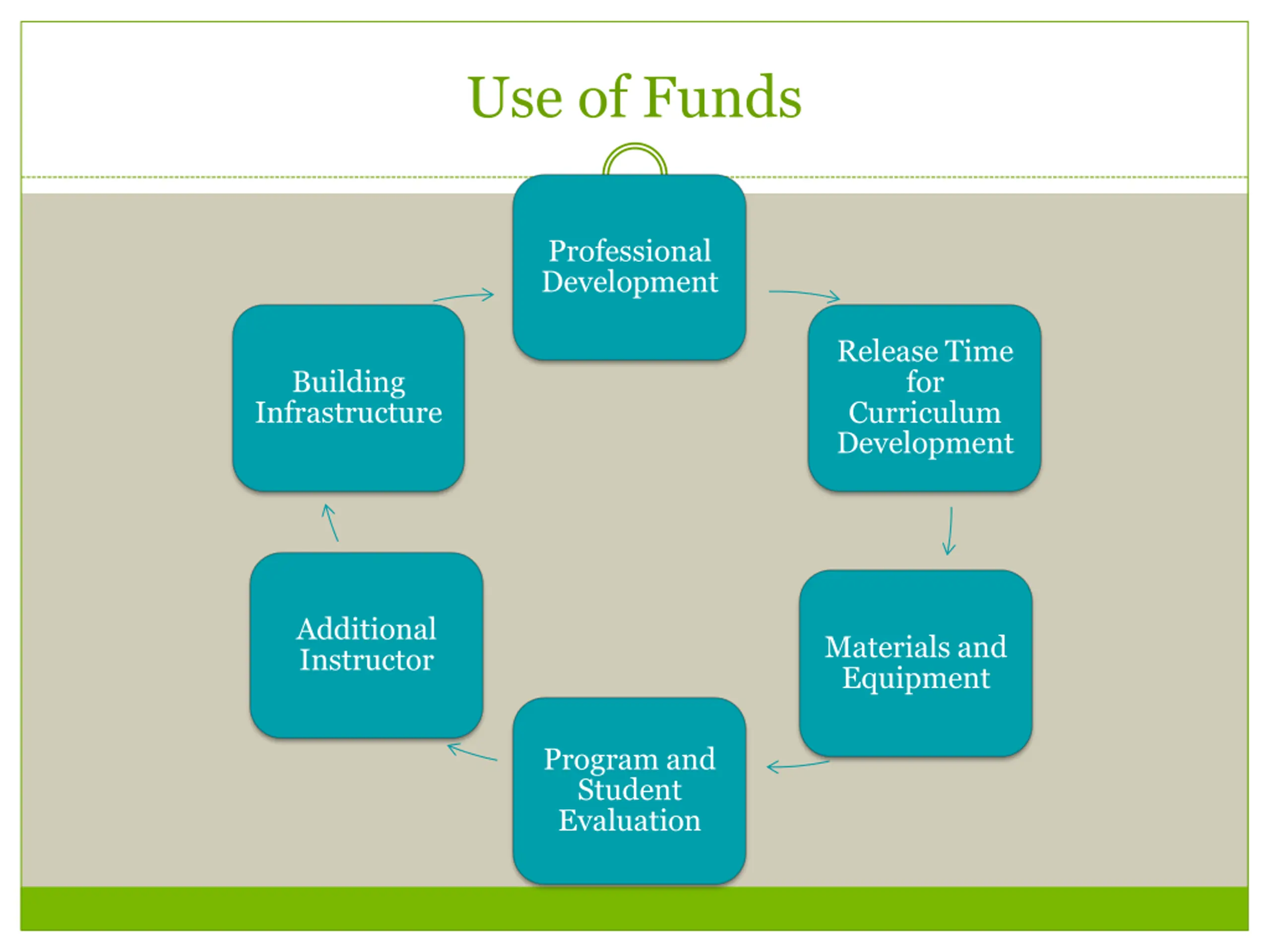 Use of Funds Professional Development Release Time for Curriculum Development Building Infrastructure Additional Instructor Materials and Equipment Program and Student Evaluation