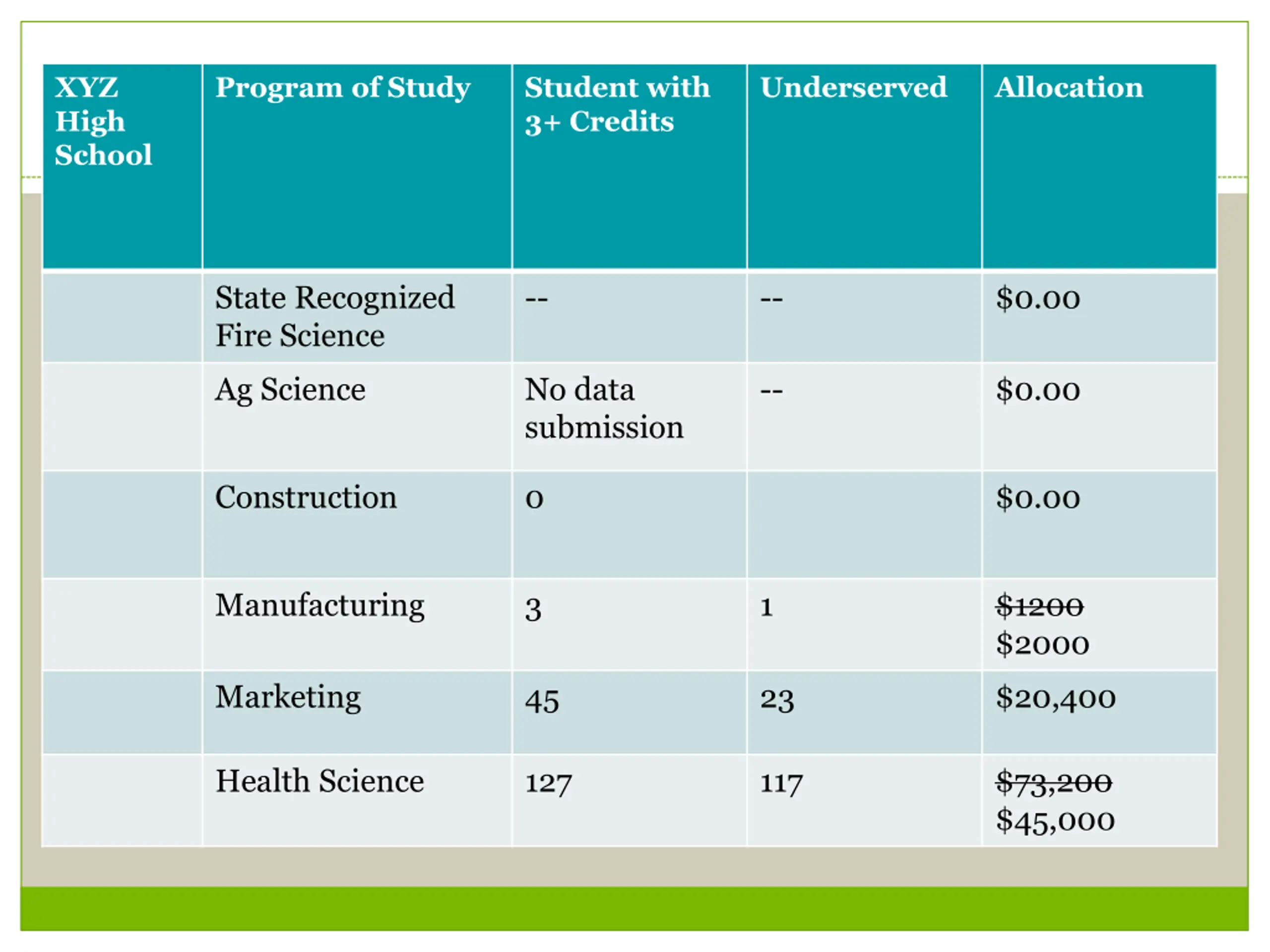 What this might look like 3+ Credits XYZ High School Program of Study Student with Underserved Allocation State Recognized Fire Science -- -- $0.00 Ag Science No data submission -- $0.00 Construction 0 $0.00 Manufacturing 3 1 $1200 $2000 Marketing 45 23 $20,400 Health Science 127 117 $73,200 $45,000