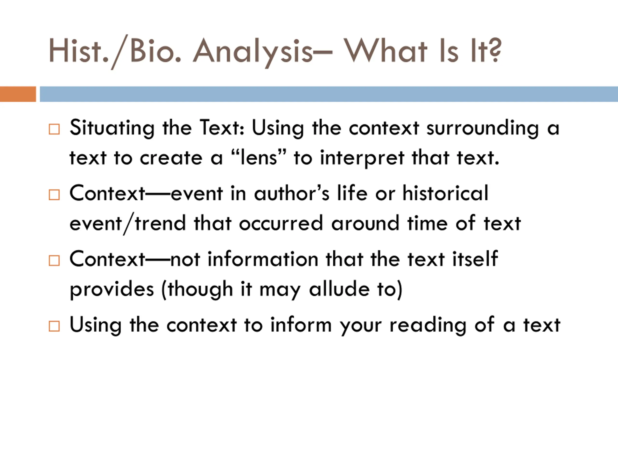 Hist./Bio. Analysis What Is It? Situating the Text: Using the context surrounding a text to create a lens to interpret that text. Context event in author s life or historical event/trend that occurred around time of text Context not information that the text itself provides (though it may allude to) Using the context to inform your reading of a text