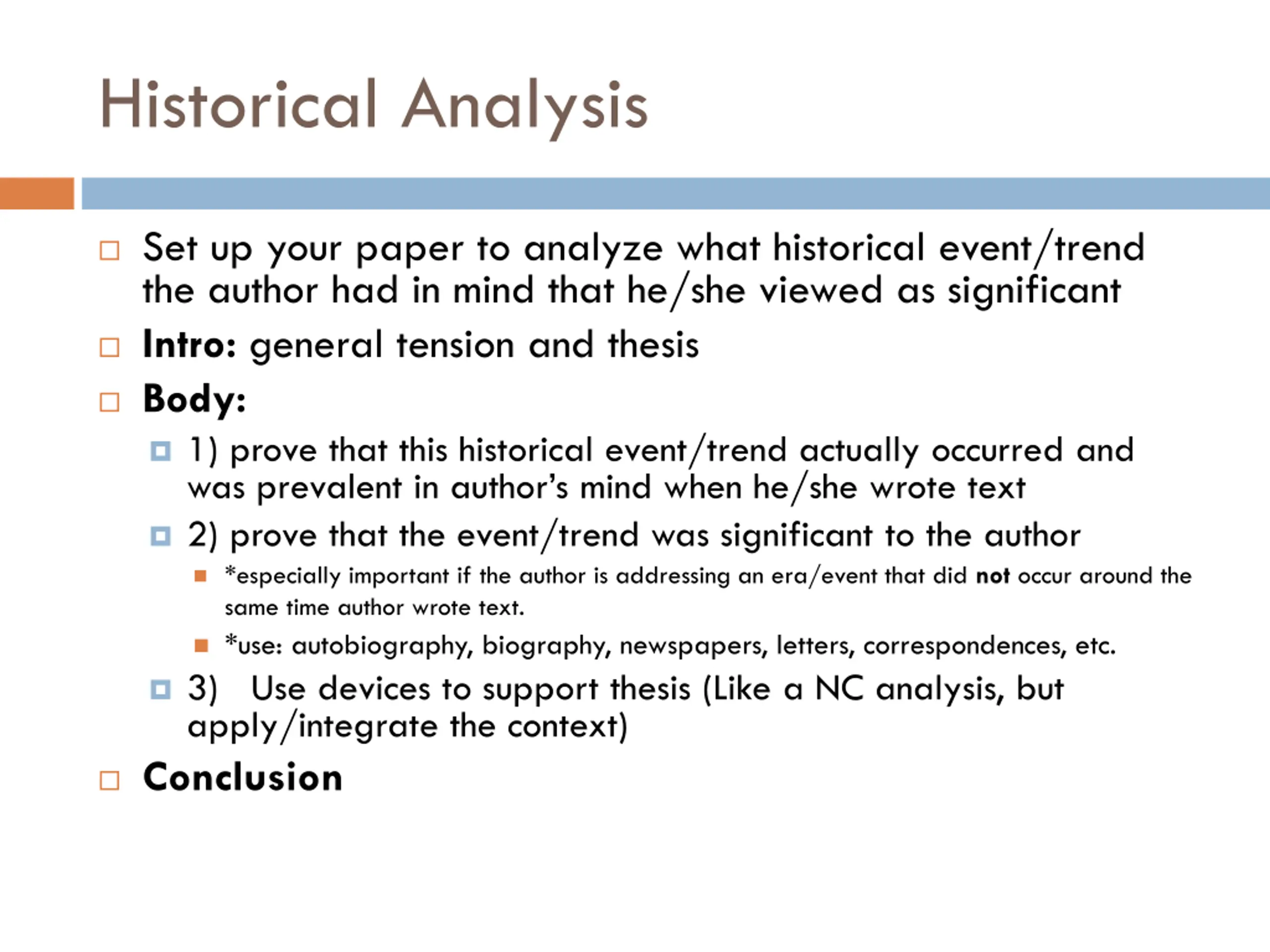 Historical Analysis Set up your paper to analyze what historical event/trend the author had in mind that he/she viewed as significant Intro: general tension and thesis Body: 1) prove that this historical event/trend actually occurred and was prevalent in author s mind when he/she wrote text 2) prove that the event/trend was significant to the author *especially important if the author is addressing an era/event that did not occur around the same time author wrote text. *use: autobiography, biography, newspapers, letters, correspondences, etc. 3) Use devices to support thesis (Like a NC analysis, but apply/integrate the context) Conclusion