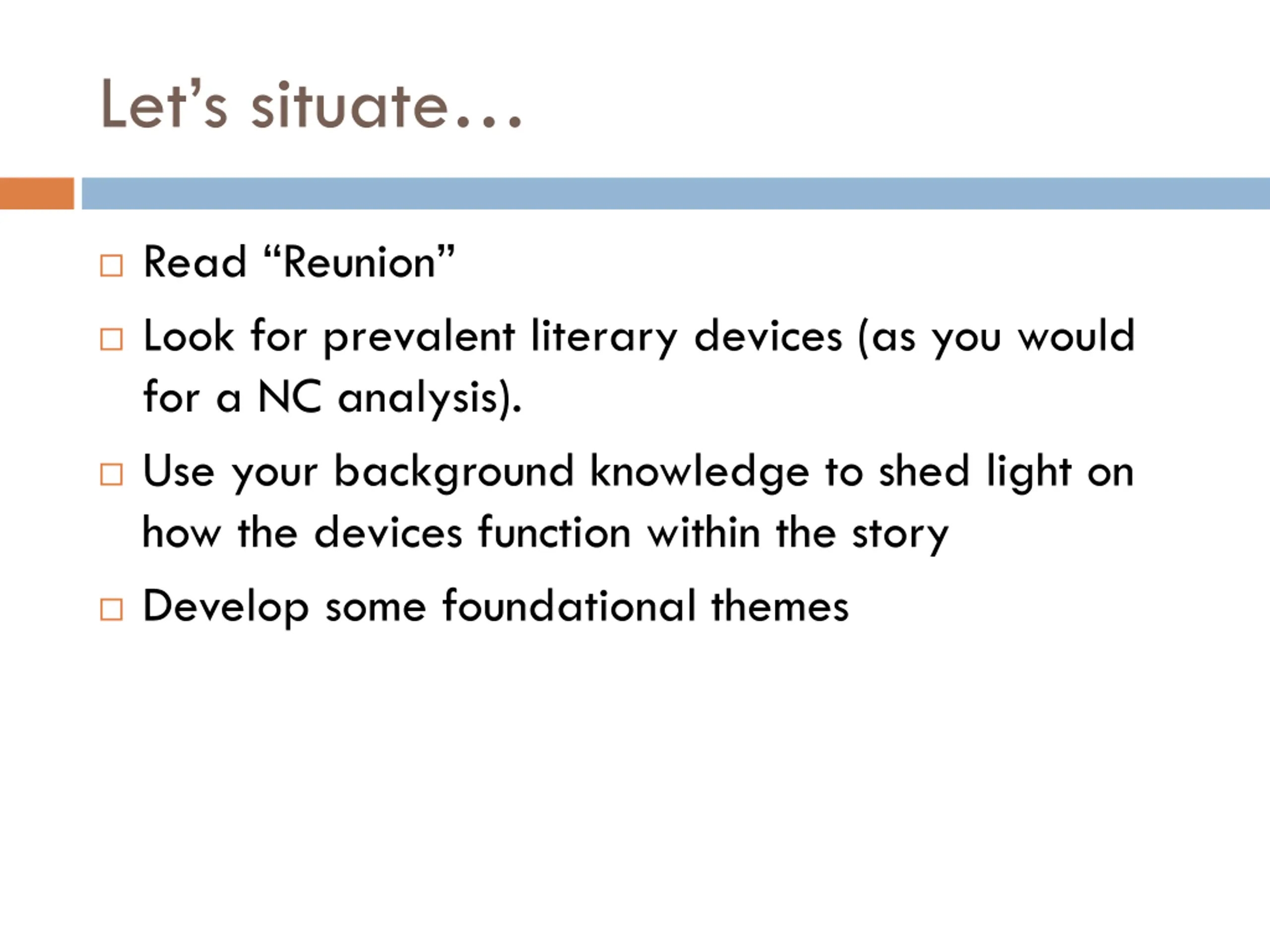 Lets situate Read Reunion Look for prevalent literary devices (as you would for a NC analysis). Use your background knowledge to shed light on how the devices function within the story Develop some foundational themes