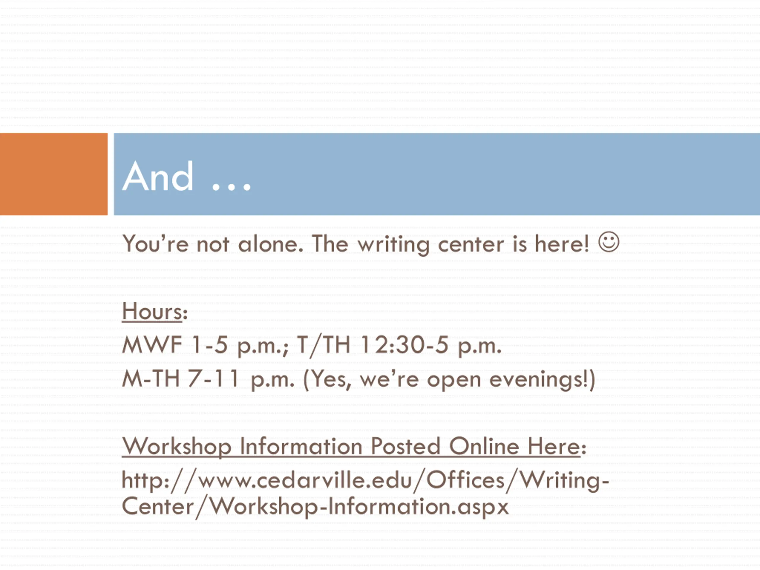 And You re not alone. The writing center is here! Hours: MWF 1-5 p.m.; T/TH 12:30-5 p.m. M-TH 7-11 p.m. (Yes, we re open evenings!) Workshop Information Posted Online Here: http://www.cedarville.edu/Offices/Writing- Center/Workshop-Information.aspx