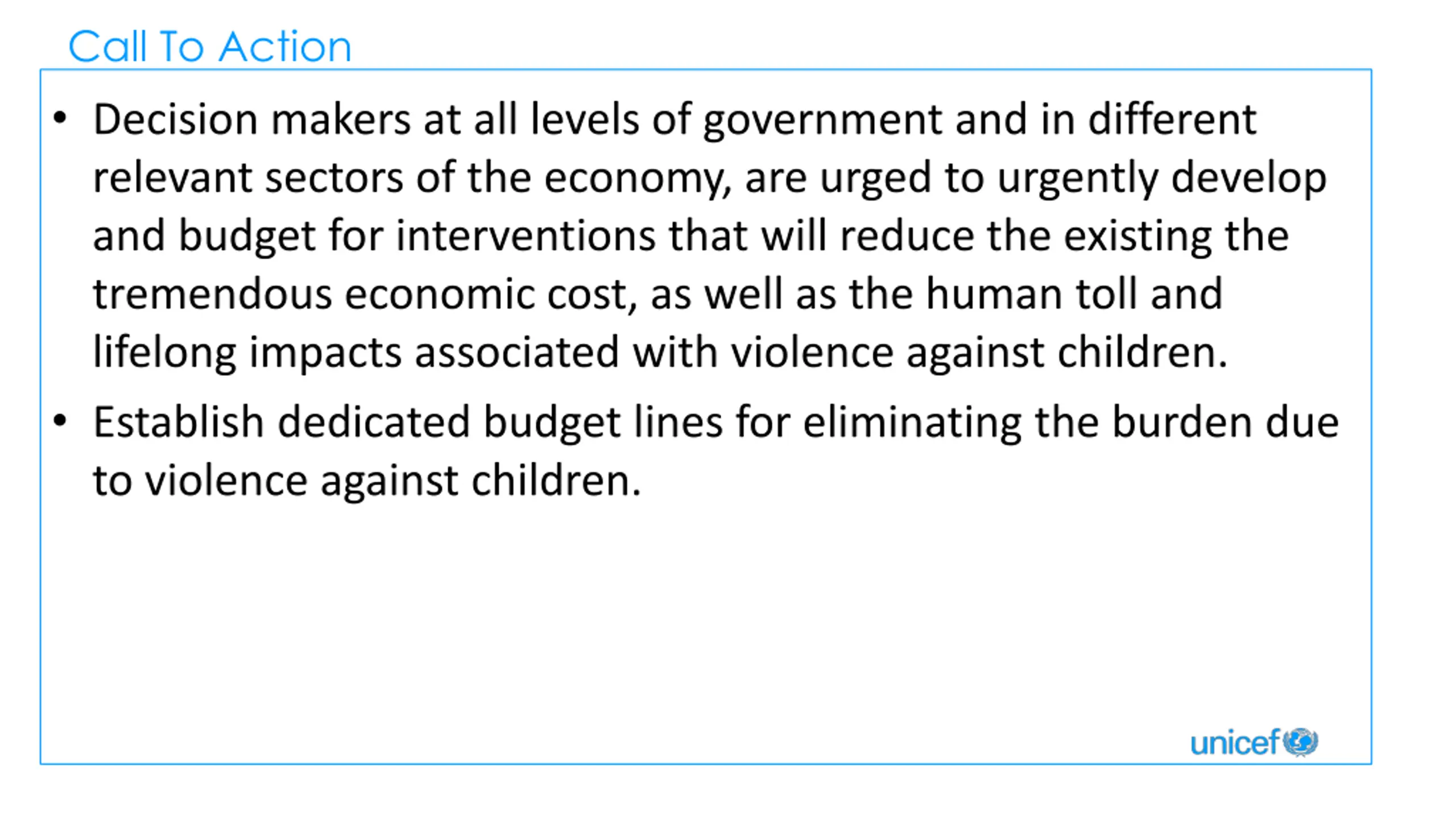 Call To Action Decision makers at all levels of government and in different relevant sectors of the economy, are urged to urgently develop and budget for interventions that will reduce the existing the tremendous economic cost, as well as the human toll and lifelong impacts associated with violence against children. Establish dedicated budget lines for eliminating the burden due to violence against children.