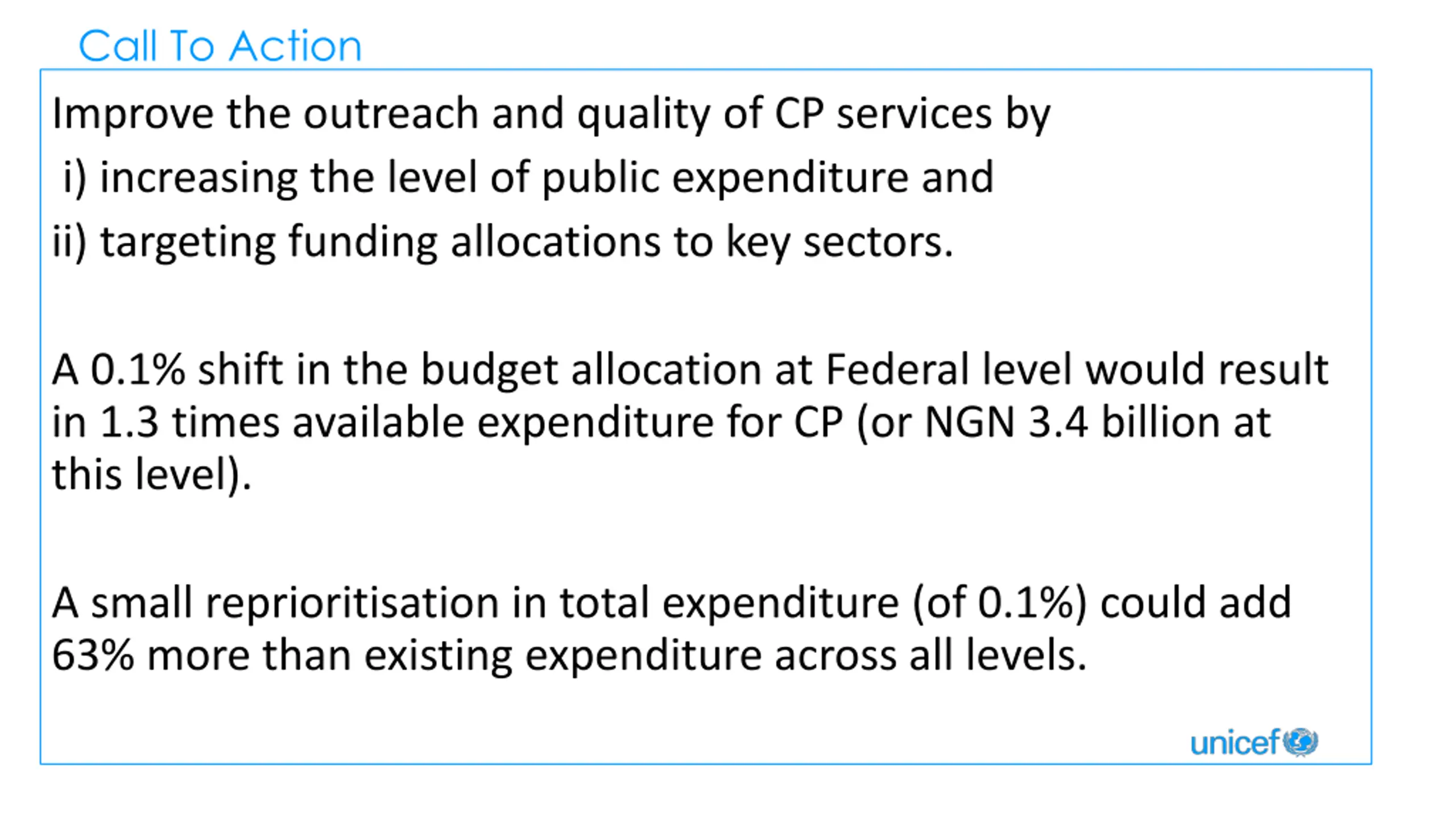 Call To Action Improve the outreach and quality of CP services by i) increasing the level of public expenditure and ii) targeting funding allocations to key sectors. A 0.1% shift in the budget allocation at Federal level would result in 1.3 times available expenditure for CP (or NGN 3.4 billion at this level). A small reprioritisation in total expenditure (of 0.1%) could add 63% more than existing expenditure across all levels.