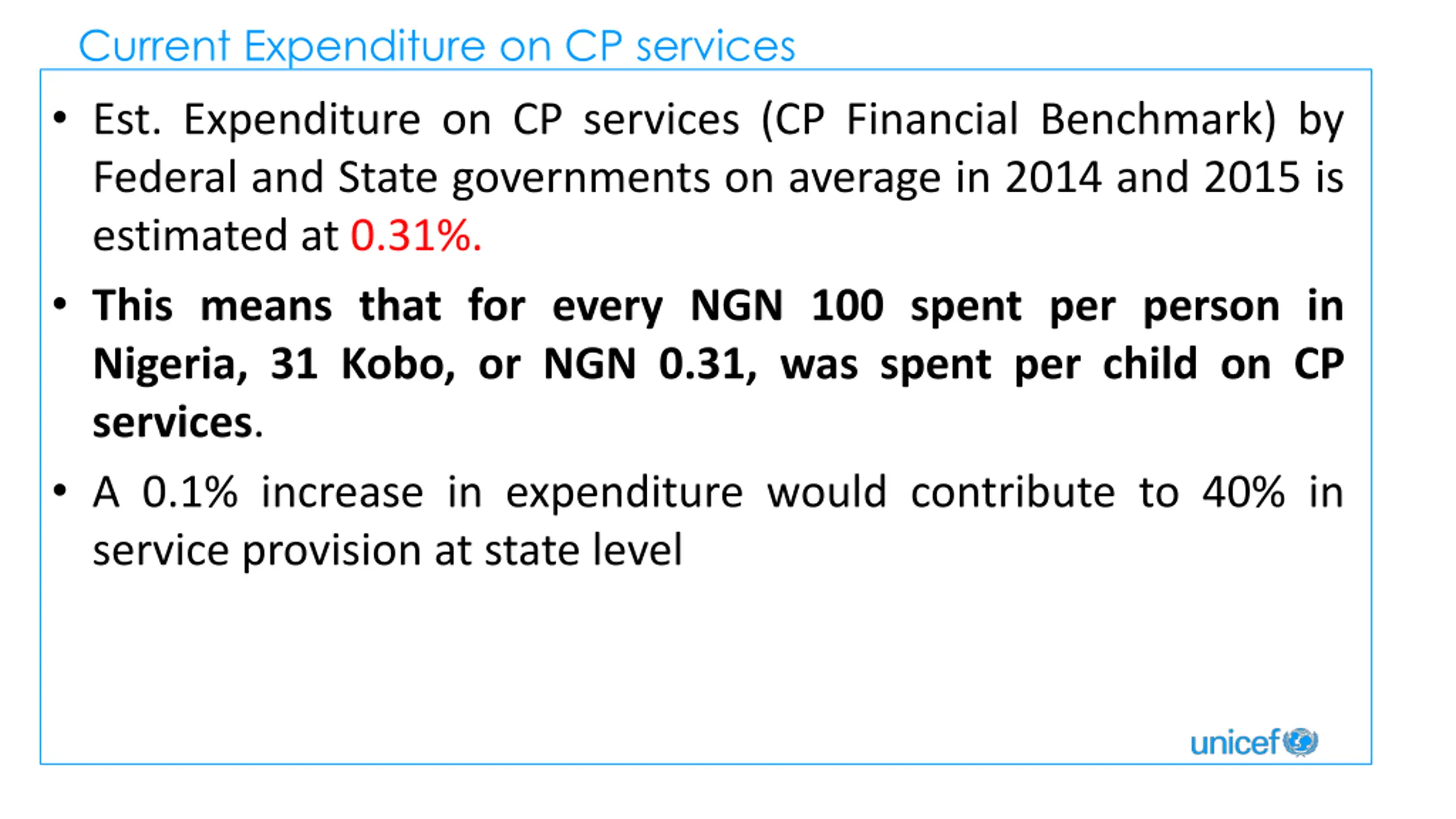 Current Expenditure on CP services Est. Expenditure on CP services (CP Financial Benchmark) by Federal and State governments on average in 2014 and 2015 is estimated at 0.31%. This means that for every NGN 100 spent per person in Nigeria, 31 Kobo, or NGN 0.31, was spent per child on CP services. A 0.1% increase in expenditure would contribute to 40% in service provision at state level