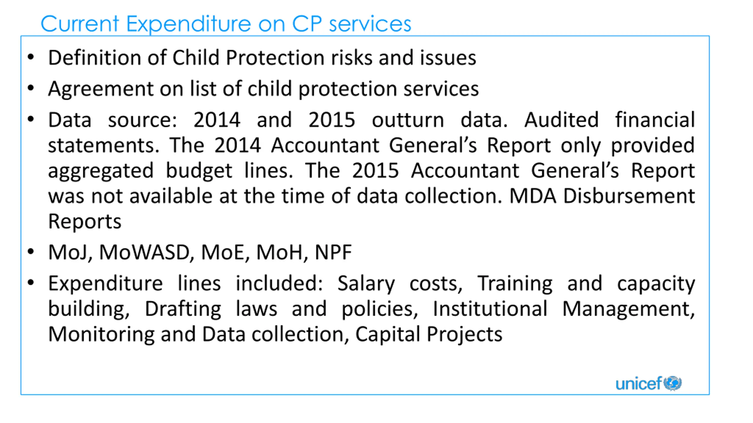 Current Expenditure on CP services Definition of Child Protection risks and issues Agreement on list of child protection services Data source: 2014 and 2015 outturn data. Audited financial statements. The 2014 Accountant General s Report only provided aggregated budget lines. The 2015 Accountant General s Report was not available at the time of data collection. MDA Disbursement Reports MoJ, MoWASD, MoE, MoH, NPF Expenditure lines included: Salary costs, Training and capacity building, Drafting laws and policies, Institutional Management, Monitoring and Data collection, Capital Projects