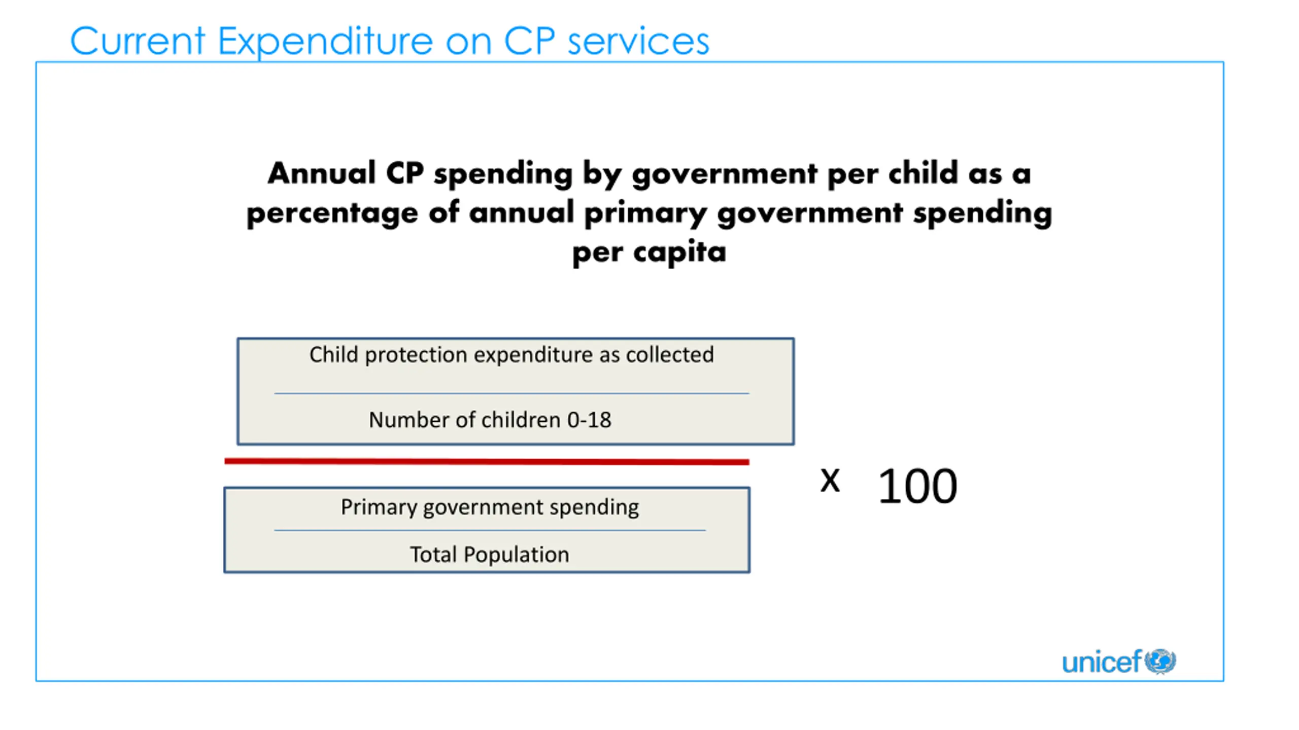Current Expenditure on CP services Annual CP spending by government per child as a percentage of annual primary government spending per capita Child protection expenditure as collected Number of children 0-18 x 100 Primary government spending Total Population