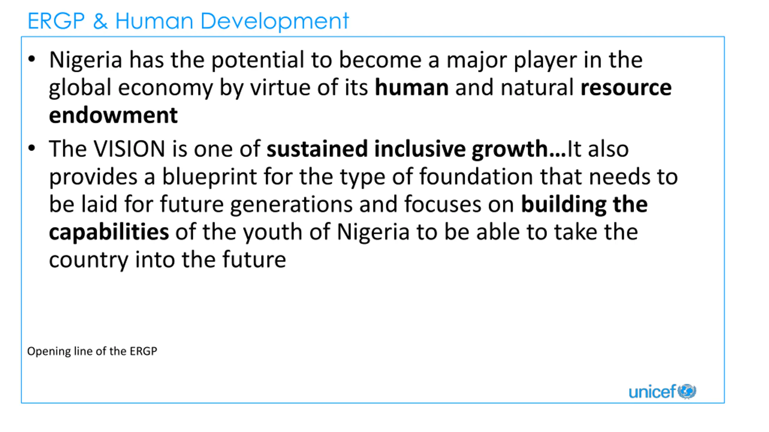 ERGP & Human Development Nigeria has the potential to become a major player in the global economy by virtue of its human and natural resource endowment The VISION is one of sustained inclusive growth It also provides a blueprint for the type of foundation that needs to be laid for future generations and focuses on building the capabilities of the youth of Nigeria to be able to take the country into the future Opening line of the ERGP
