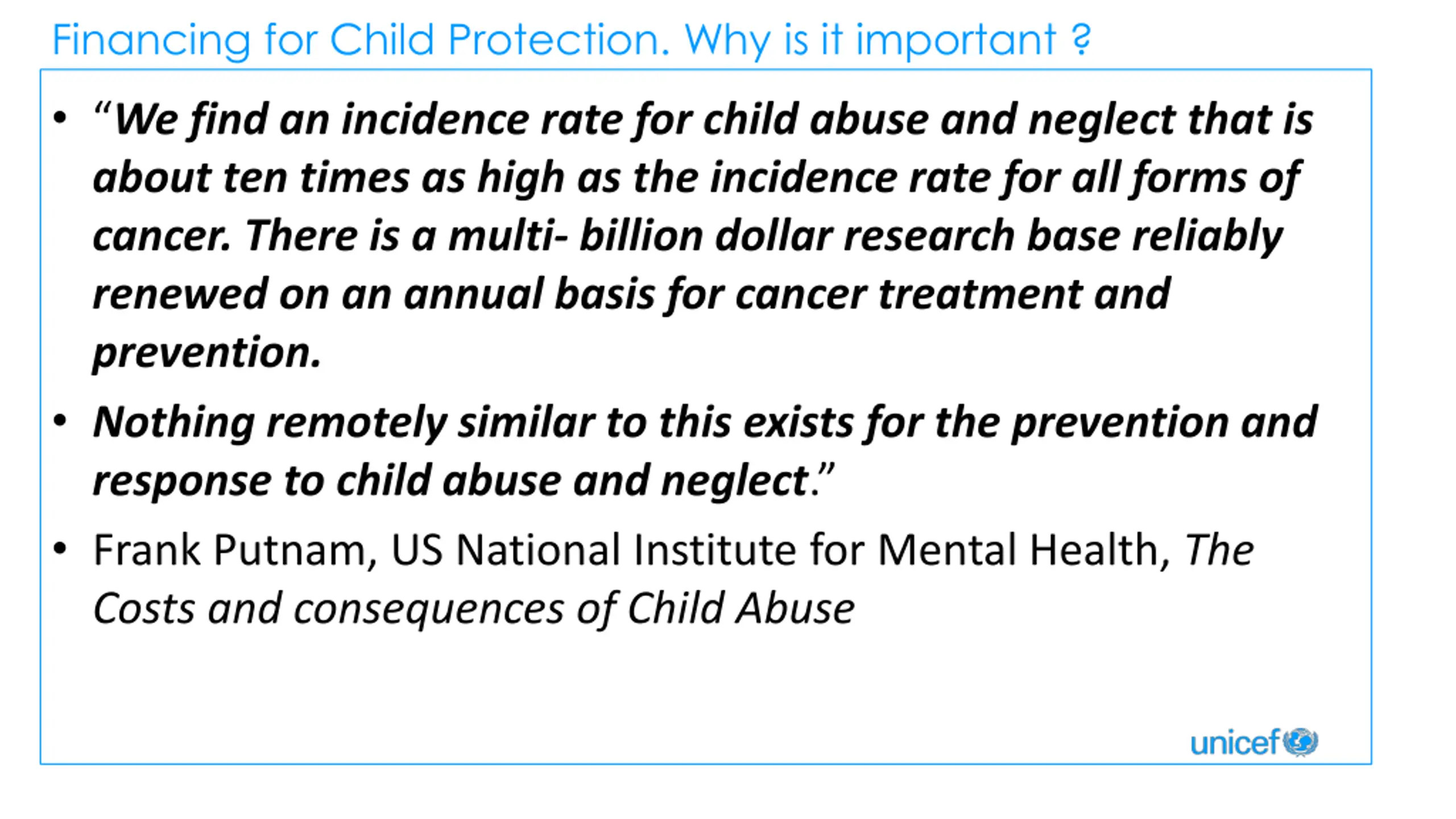 Financing for Child Protection. Why is it important ? We find an incidence rate for child abuse and neglect that is about ten times as high as the incidence rate for all forms of cancer. There is a multi- billion dollar research base reliably renewed on an annual basis for cancer treatment and prevention. Nothing remotely similar to this exists for the prevention and response to child abuse and neglect. Frank Putnam, US National Institute for Mental Health, The Costs and consequences of Child Abuse