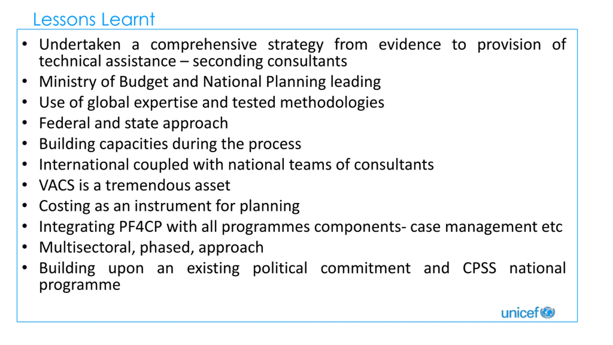 Lessons Learnt Undertaken a comprehensive strategy from evidence to provision of technical assistance seconding consultants Ministry of Budget and National Planning leading Use of global expertise and tested methodologies Federal and state approach Building capacities during the process International coupled with national teams of consultants VACS is a tremendous asset Costing as an instrument for planning Integrating PF4CP with all programmes components- case management etc Multisectoral, phased, approach Building upon an existing political commitment and CPSS national programme