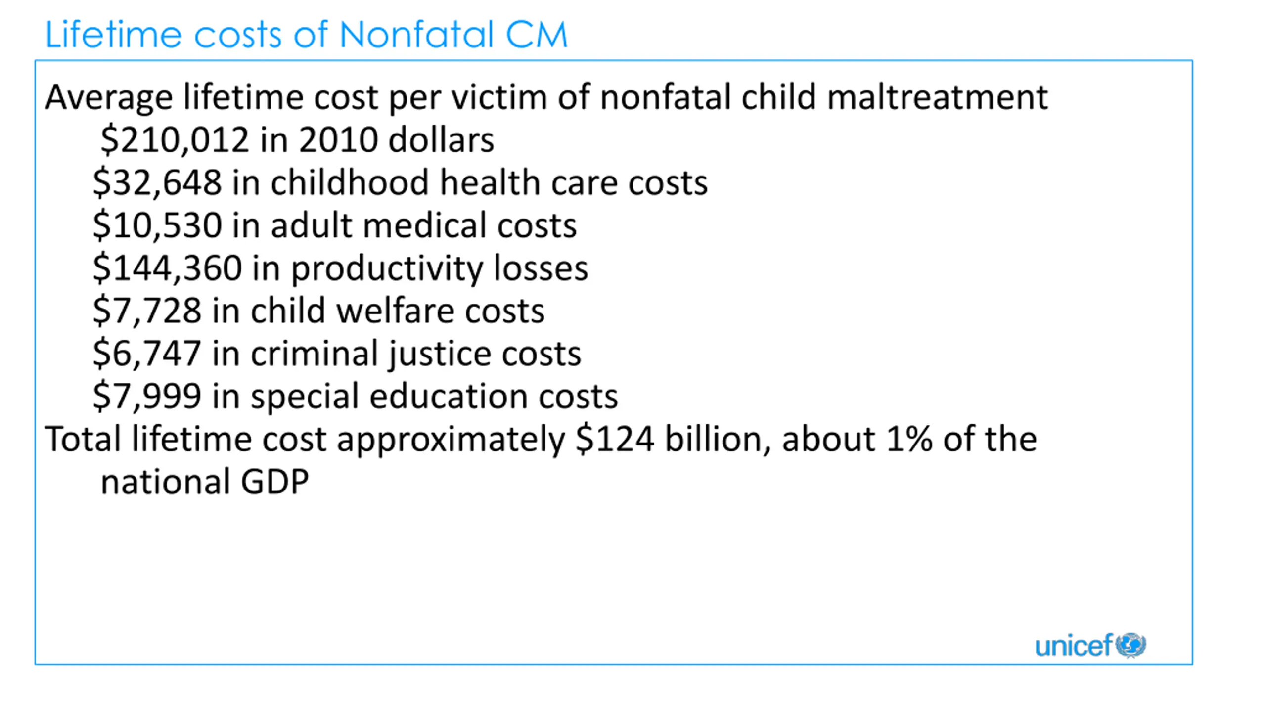 Lifetime costs of Nonfatal CM Average lifetime cost per victim of nonfatal child maltreatment $210,012 in 2010 dollars $32,648 in childhood health care costs $10,530 in adult medical costs $144,360 in productivity losses $7,728 in child welfare costs $6,747 in criminal justice costs $7,999 in special education costs Total lifetime cost approximately $124 billion, about 1% of the national GDP