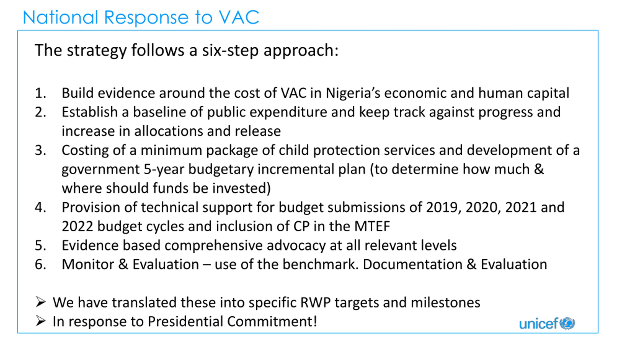 National Response to VAC The strategy follows a six-step approach: 1. 2. Build evidence around the cost of VAC in Nigeria s economic and human capital Establish a baseline of public expenditure and keep track against progress and increase in allocations and release Costing of a minimum package of child protection services and development of a government 5-year budgetary incremental plan (to determine how much & where should funds be invested) Provision of technical support for budget submissions of 2019, 2020, 2021 and 2022 budget cycles and inclusion of CP in the MTEF Evidence based comprehensive advocacy at all relevant levels Monitor & Evaluation use of the benchmark. Documentation & Evaluation 3. 4. 5. 6. We have translated these into specific RWP targets and milestones In response to Presidential Commitment!