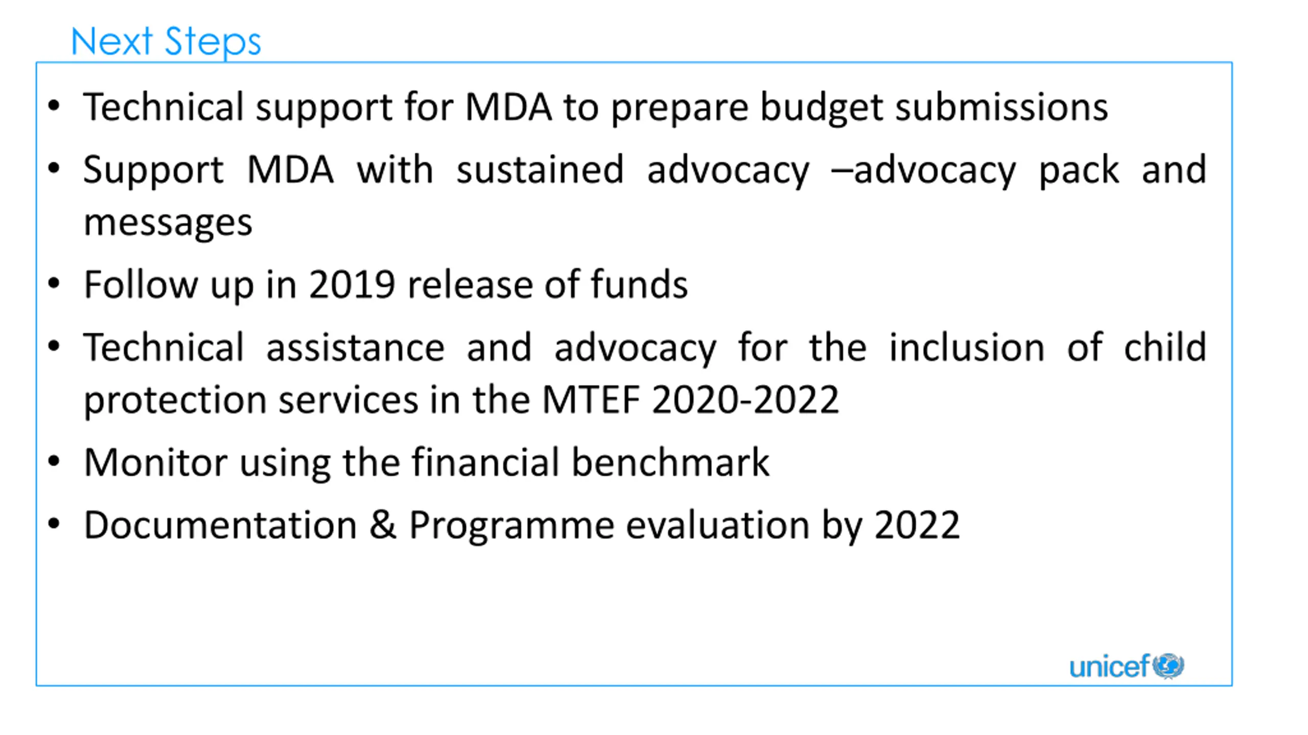 Next Steps Technical support for MDA to prepare budget submissions Support MDA with sustained advocacy advocacy pack and messages Follow up in 2019 release of funds Technical assistance and advocacy for the inclusion of child protection services in the MTEF 2020-2022 Monitor using the financial benchmark Documentation & Programme evaluation by 2022