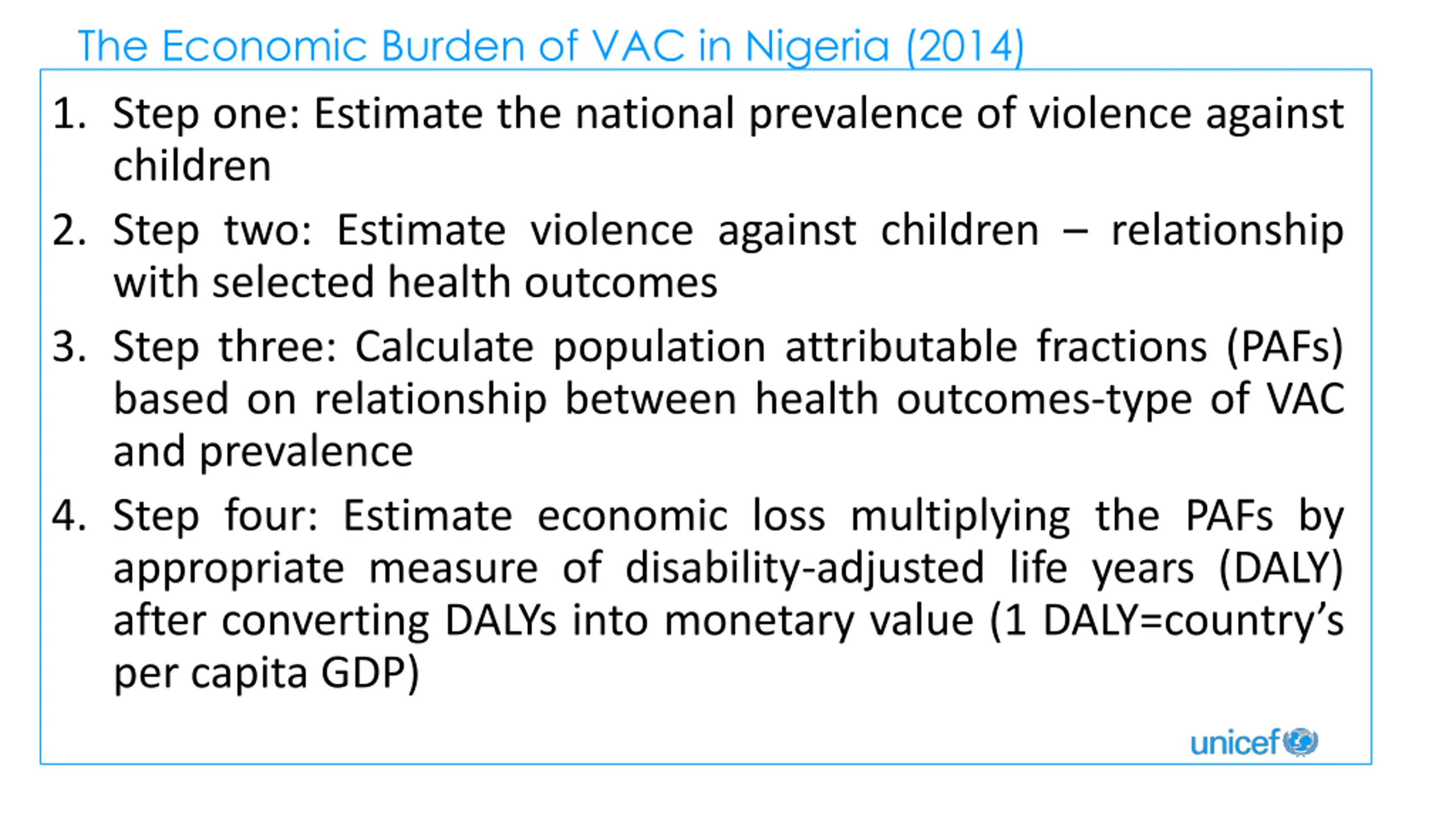 The Economic Burden of VAC in Nigeria (2014) 1. Step one: Estimate the national prevalence of violence against children 2. Step two: Estimate violence against children relationship with selected health outcomes 3. Step three: Calculate population attributable fractions (PAFs) based on relationship between health outcomes-type of VAC and prevalence 4. Step four: Estimate economic loss multiplying the PAFs by appropriate measure of disability-adjusted life years (DALY) after converting DALYs into monetary value (1 DALY=country s per capita GDP)