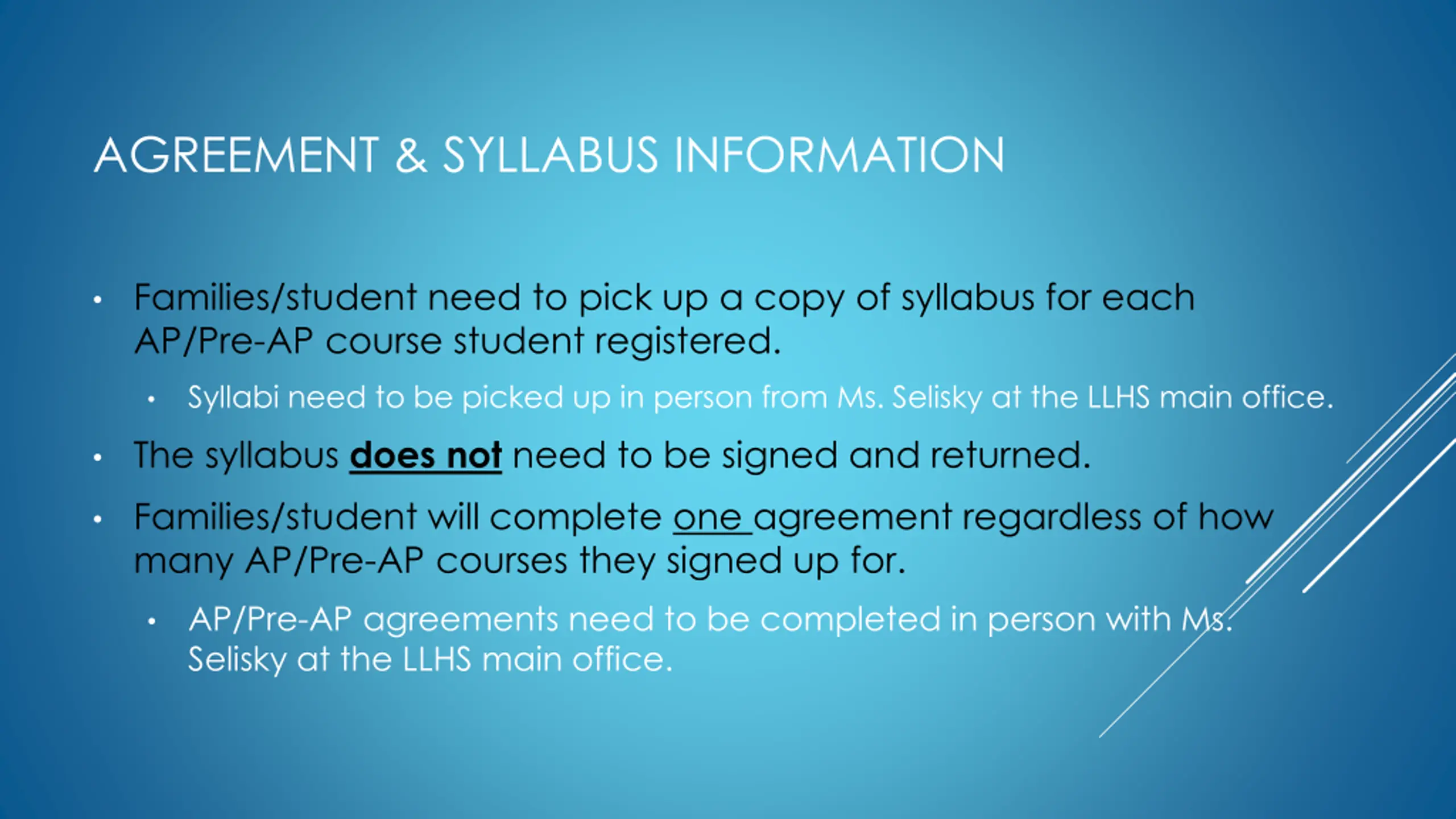 AGREEMENT & SYLLABUS INFORMATION Families/student need to pick up a copy of syllabus for each AP/Pre-AP course student registered. Syllabi need to be picked up in person from Ms. Selisky at the LLHS main office. The syllabus does not need to be signed and returned. Families/student will complete one agreement regardless of how many AP/Pre-AP courses they signed up for. AP/Pre-AP agreements need to be completed in person with Ms. Selisky at the LLHS main office.
