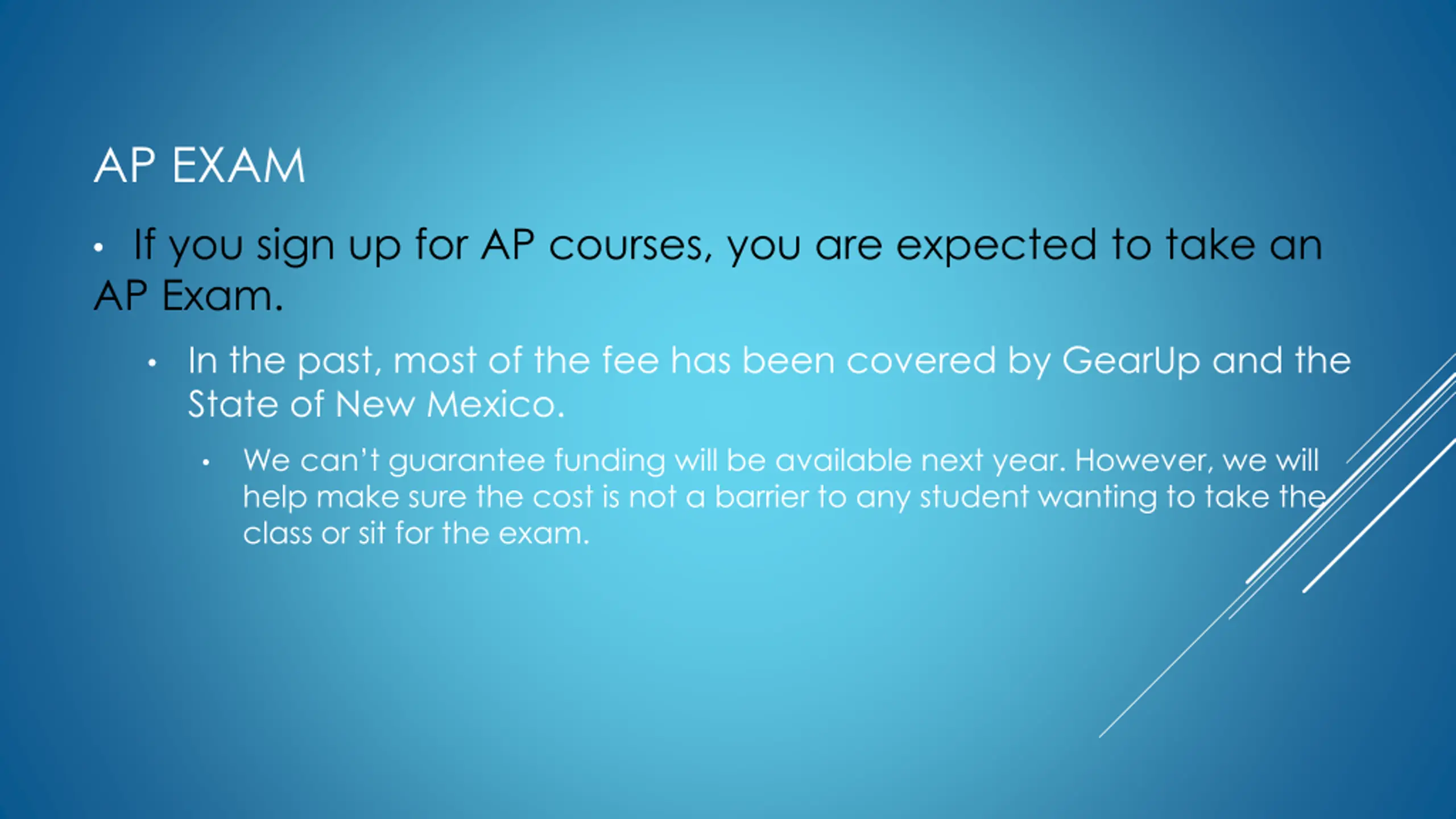AP EXAM If you sign up for AP courses, you are expected to take an AP Exam. In the past, most of the fee has been covered by GearUp and the State of New Mexico. We can t guarantee funding will be available next year. However, we will help make sure the cost is not a barrier to any student wanting to take the class or sit for the exam.