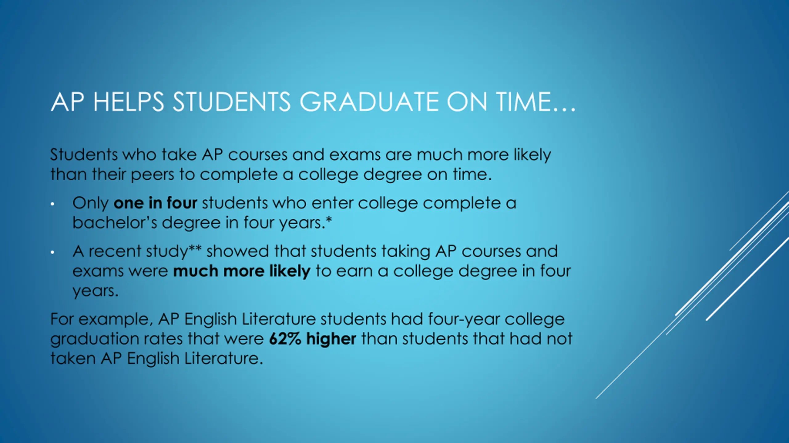 AP HELPS STUDENTS GRADUATE ON TIME Students who take AP courses and exams are much more likely than their peers to complete a college degree on time. Only one in four students who enter college complete a bachelor s degree in four years.* A recent study** showed that students taking AP courses and exams were much more likely to earn a college degree in four years. For example, AP English Literature students had four-year college graduation rates that were 62% higher than students that had not taken AP English Literature.