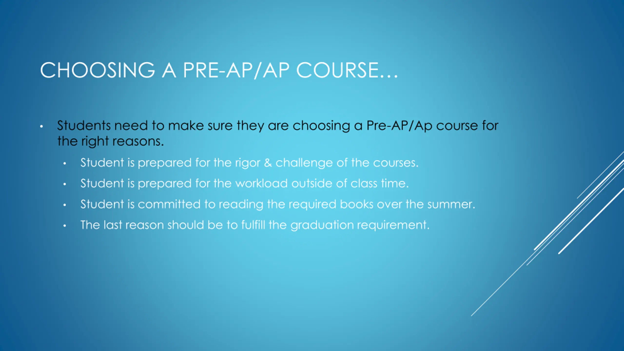 CHOOSING A PRE-AP/AP COURSE Students need to make sure they are choosing a Pre-AP/Ap course for the right reasons. Student is prepared for the rigor & challenge of the courses. Student is prepared for the workload outside of class time. Student is committed to reading the required books over the summer. The last reason should be to fulfill the graduation requirement.