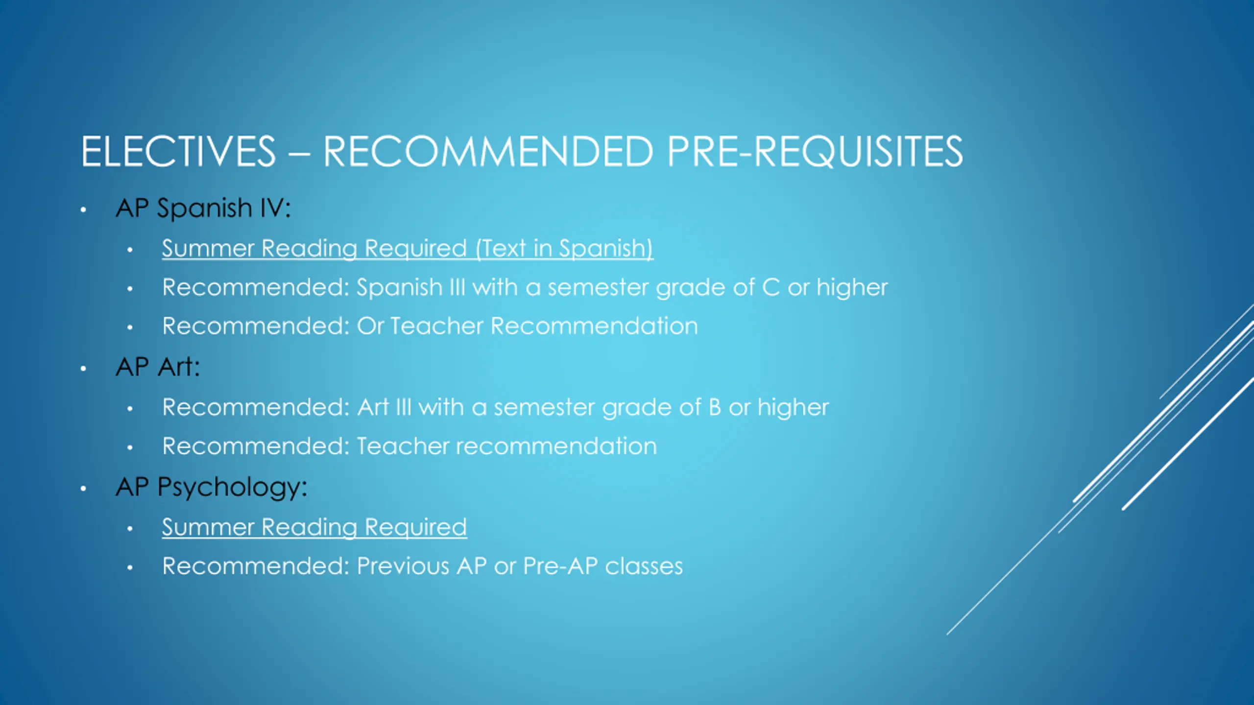 ELECTIVES RECOMMENDED PRE-REQUISITES AP Spanish IV: Summer Reading Required (Text in Spanish) Recommended: Spanish III with a semester grade of C or higher Recommended: Or Teacher Recommendation AP Art: Recommended: Art III with a semester grade of B or higher Recommended: Teacher recommendation AP Psychology: Summer Reading Required Recommended: Previous AP or Pre-AP classes