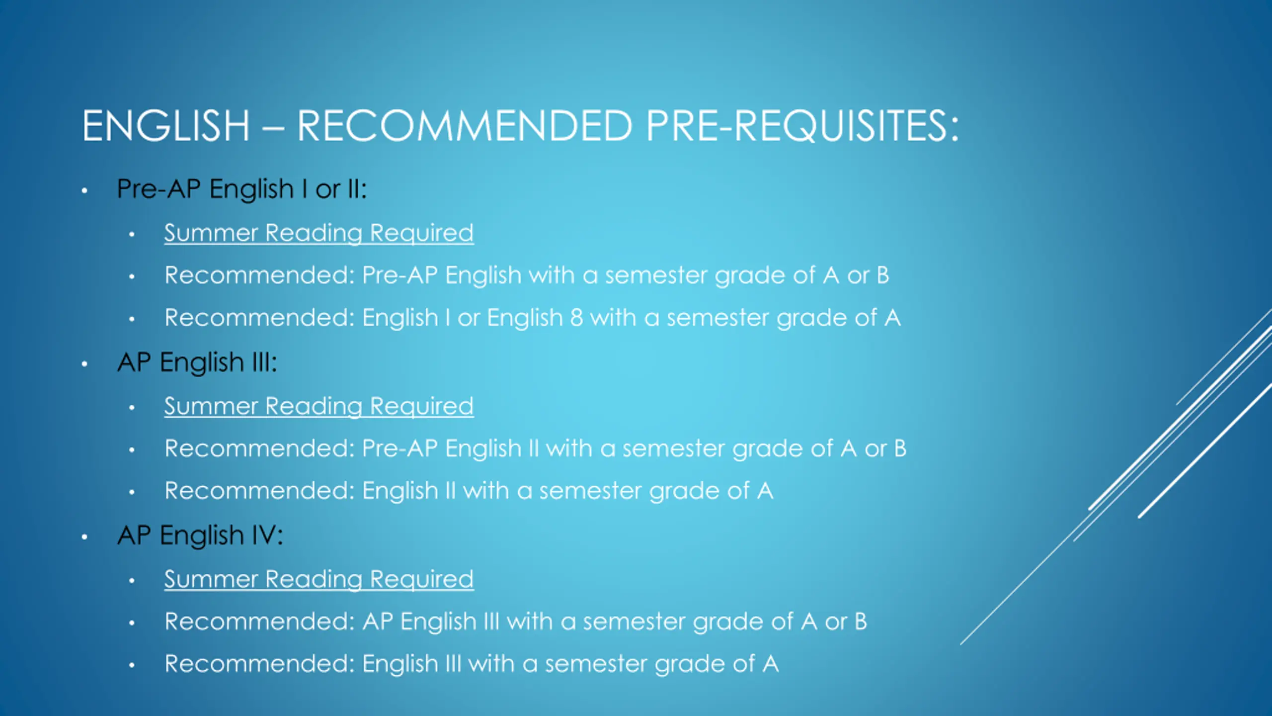 ENGLISH RECOMMENDED PRE-REQUISITES: Pre-AP English I or II: Summer Reading Required Recommended: Pre-AP English with a semester grade of A or B Recommended: English I or English 8 with a semester grade of A AP English III: Summer Reading Required Recommended: Pre-AP English II with a semester grade of A or B Recommended: English II with a semester grade of A AP English IV: Summer Reading Required Recommended: AP English III with a semester grade of A or B Recommended: English III with a semester grade of A