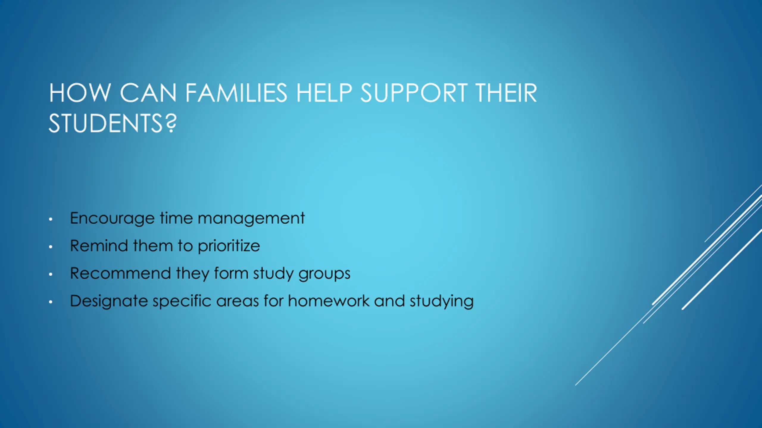 HOW CAN FAMILIES HELP SUPPORT THEIR STUDENTS? Encourage time management Remind them to prioritize Recommend they form study groups Designate specific areas for homework and studying